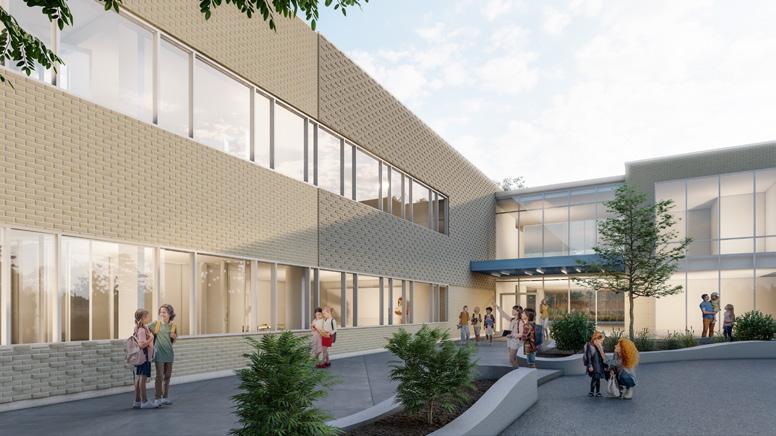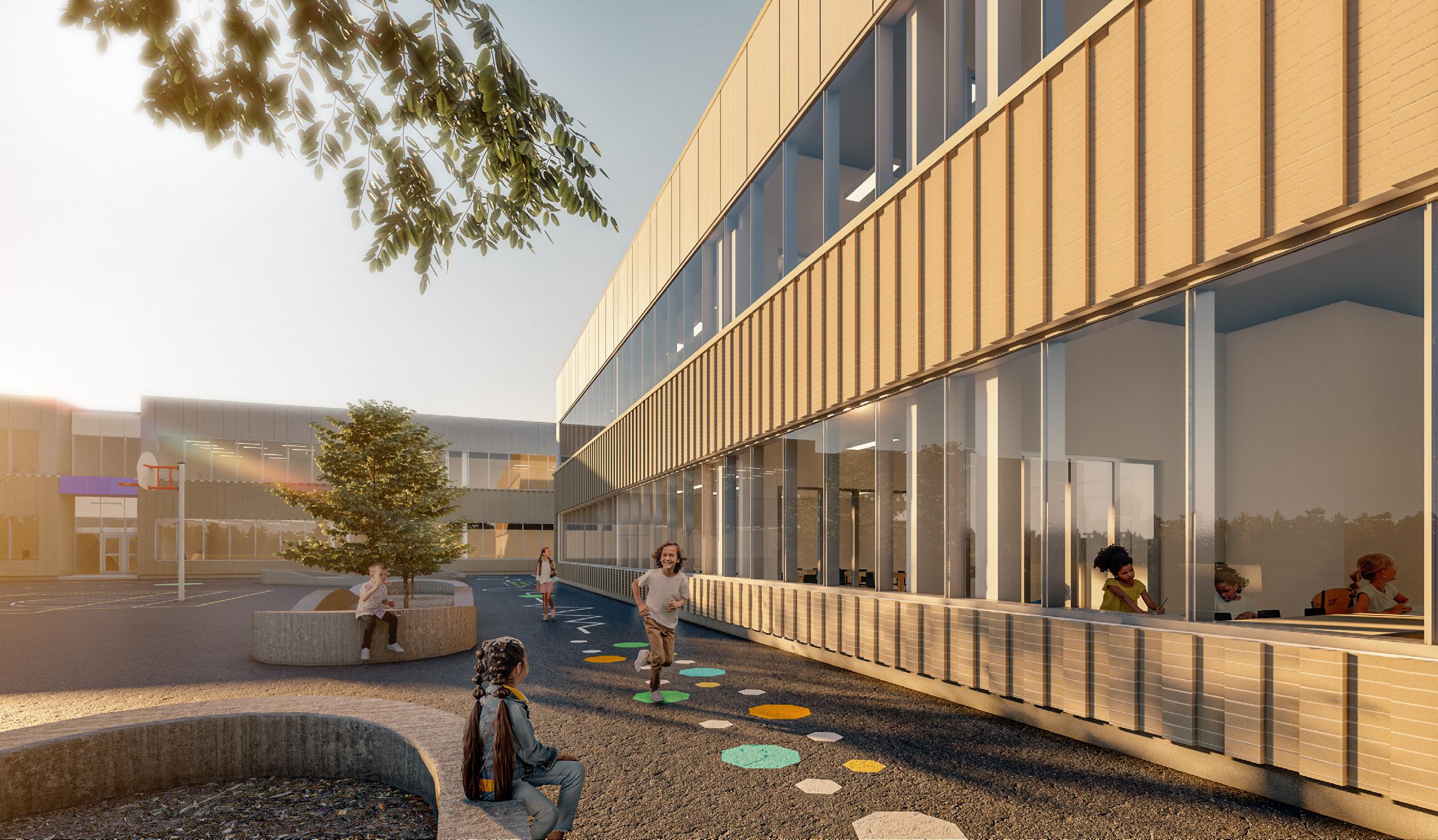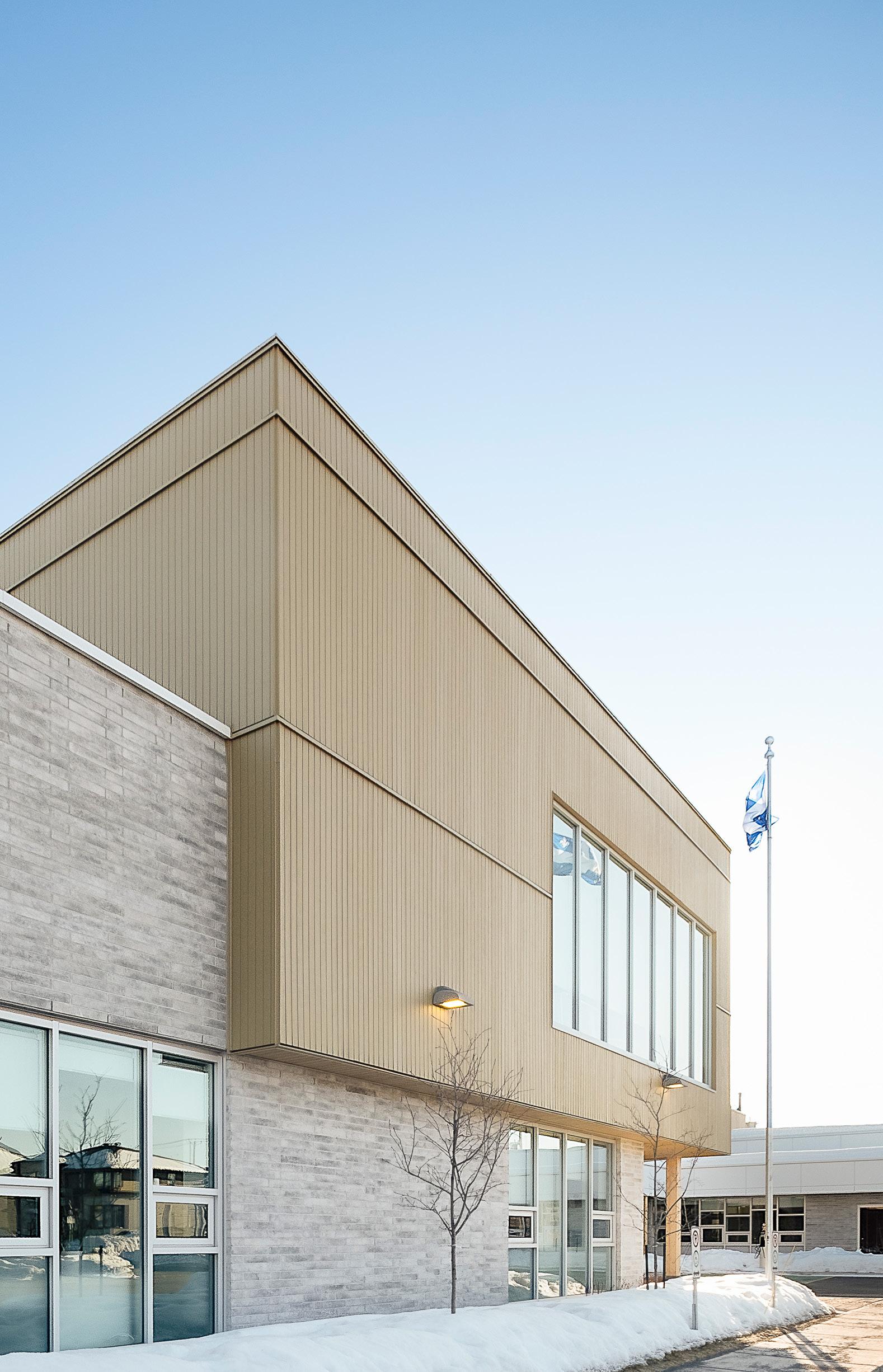 D’abord, l’école se déploie selon la topographie du site. Plus précisément, six demi-niveaux sont créés afin d’articuler subtilement et dans une fluidité la progression des niveaux scolaires. Dans cet ordre, du préscolaire à la 6e année, le programme se développe en cascade du point bas du site vers des niveaux plus élevés, à l’image du territoire. En plus de jouer sur la notion de progression, la disposition topographique du programme, conjointement aux relations visuelles créées entre les différents niveaux scolaires, propose la projection de l’élève vers son devenir, favorisant la curiosité, la prospection et le développement intellectuel et social. Un grand parvis qui se transforme en place publique pour tenir les activités sociales et communautaires et accéder à l’entrée publique de l’école.