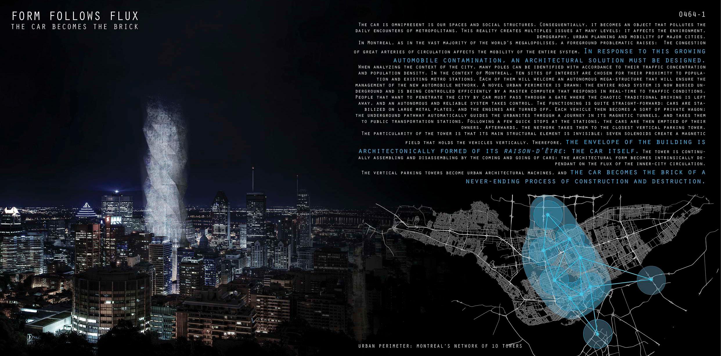 À Montréal, comme dans la grande majorité des mégalopoles du monde, une problématique de premier plan se pose : l’encombrement des grandes artères de circulation affecte la mobilité de l’ensemble du système. Cette grande ville canadienne possède un réseau de transports en commun déficient, ce qui nécessite un renouvellement majeur qui doit répondre au fléau de la voiture. Le nouveau système ne doit pas se concentrer sur la pensée individualiste, mais plutôt sur un mouvement collectif. Face à cette contamination croissante des automobiles, une solution architecturale doit être conçue.