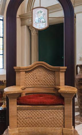 The Cathedra, or bishop’s chair, features the diocesan coat of arms carved into the stone. It symbolizes the teaching and guidance authority of the bishop.