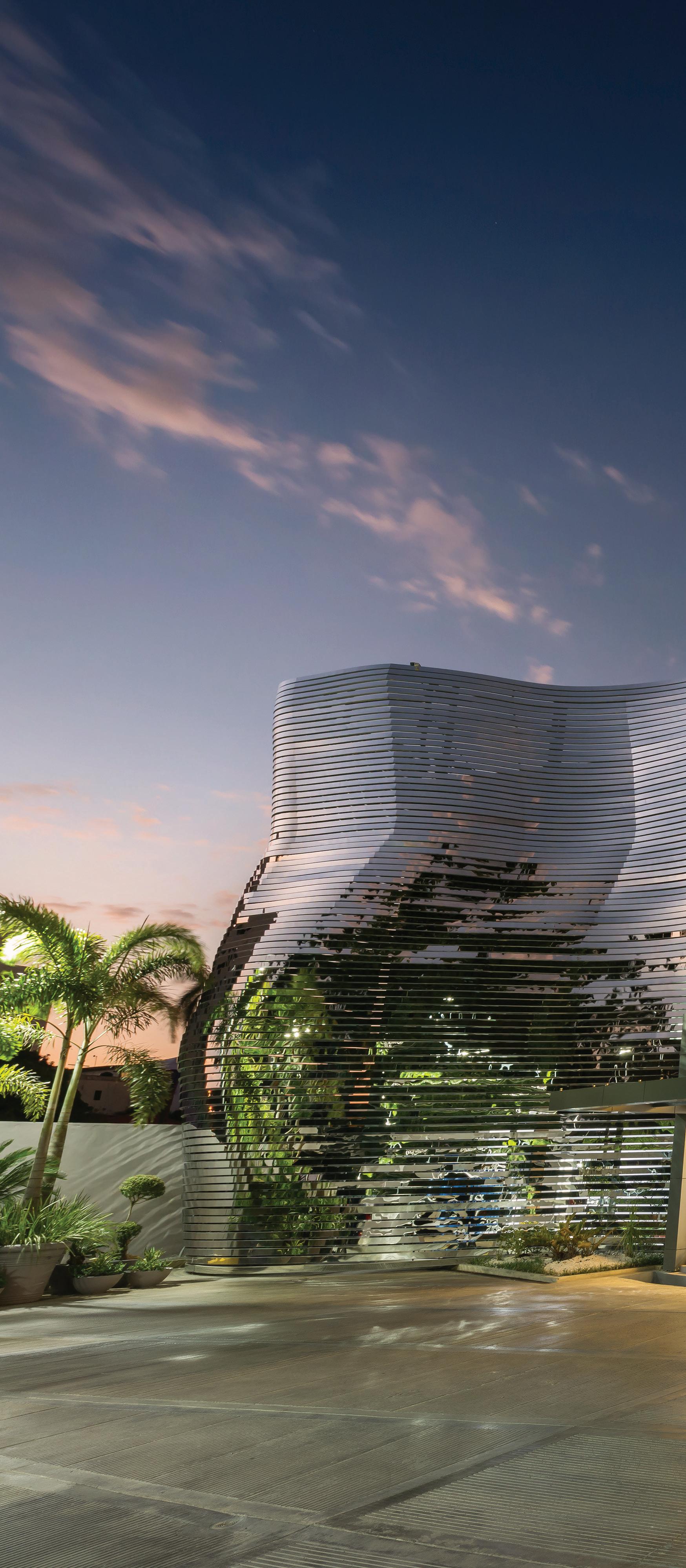 EL CONCEPTO INICIAL FUE EL DE CREAR UNA FACHADA ORGÁNICA, UNA ESPECIE DE PIEL COMPUESTA POR SINUOSAS CURVAS INSPIRA DAS EN LAS FORMAS DEL CUERPO HUMANO, QUE EXPRESARA LA NA TURALEZA DEL EDIFICIO Y QUE A LA VEZ REFLEJARA LA PERSONALIDAD DEL CLIENTE. El diseño final de la fachada es una envolvente creada a partir de un modelo paramétrico (creado con el software Rhynoceros para modelado en tres dimensiones). La fachada fue confeccionada localmente por la firma Cerartec y está compuesta por más de tres mil perfiles de acero inoxidable con acabado es pejo (mirror finished), cada uno con dos piezas cortadas CNC y armadas con cinta estructural 3M, similar a los usados en aviación, sobre una estructura metálica de soporte.