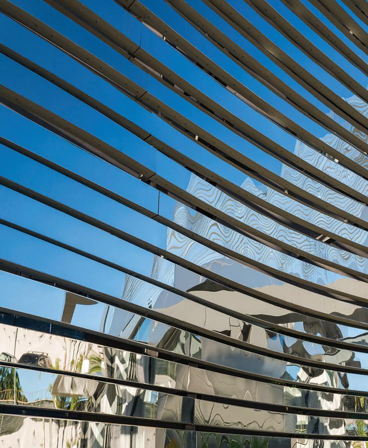 ADEMÁS DE APORTAR UNA ESTÉTICA IMPRESIONANTE, LA SINGULAR ENVOLVENTE DE FORMAS ORGÁNICAS PROTEGE EL EDIFICIO GRACIAS A LA REFLEXIÓN DE LOS RAYOS SOLARES Y A LA CÁMARA VENTILADA QUE LA SEPARA DE LA ESTRUCTURA. EL RESULTADO ES UN CONSIDERABLE AHORRO ENERGÉTICO Y UN AMBIENTE INTERIOR ACOGEDOR.