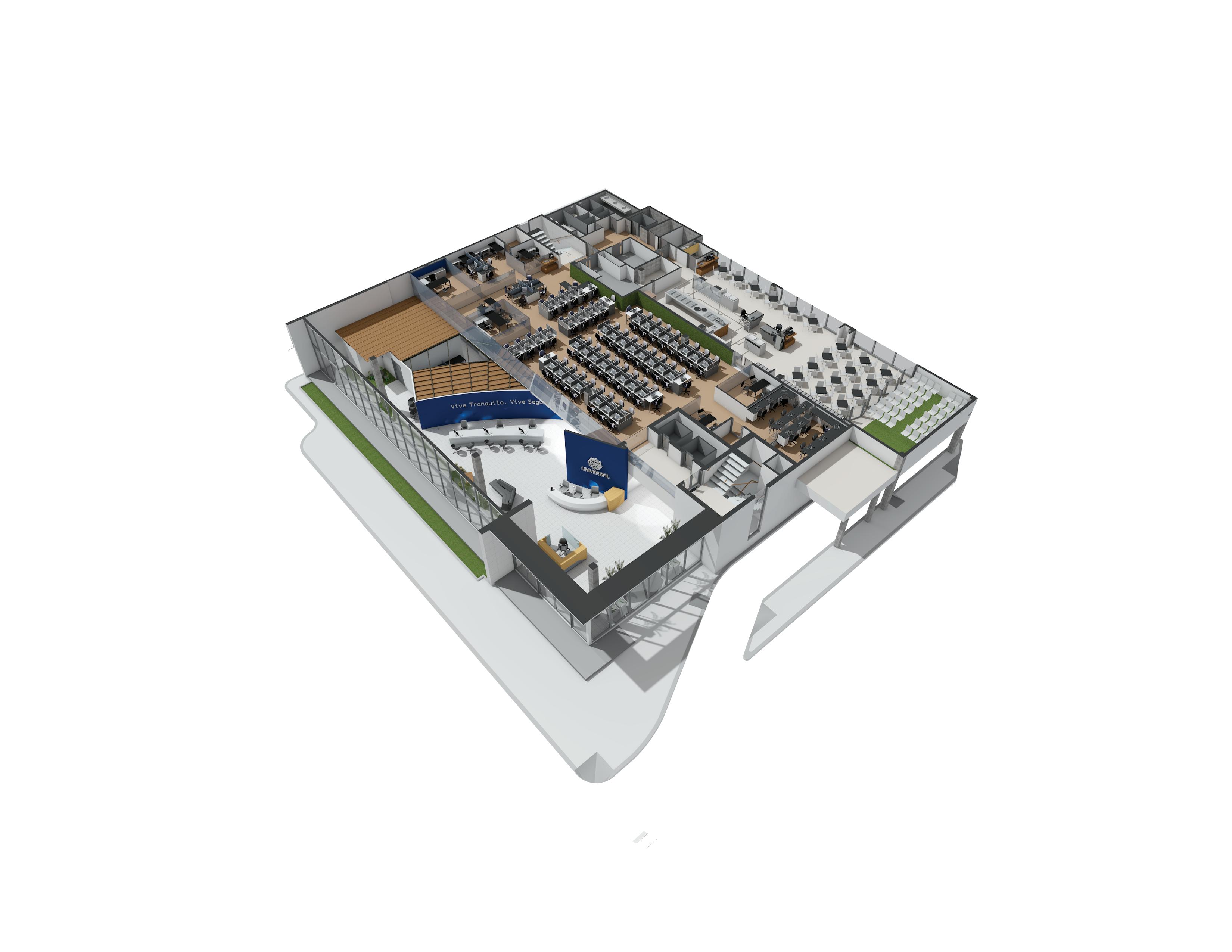 12. Área de espera Servicio al cliente 13. Área de espera Servicio Automotriz / Caja 14. Área de espera Vacunación 15. Gestores de negocios 16. Expansión de negocios 17. Gestores externos / Sala de reunión 18. Gerente de negocios 19. Reunión informal 20. Sala de reuniones