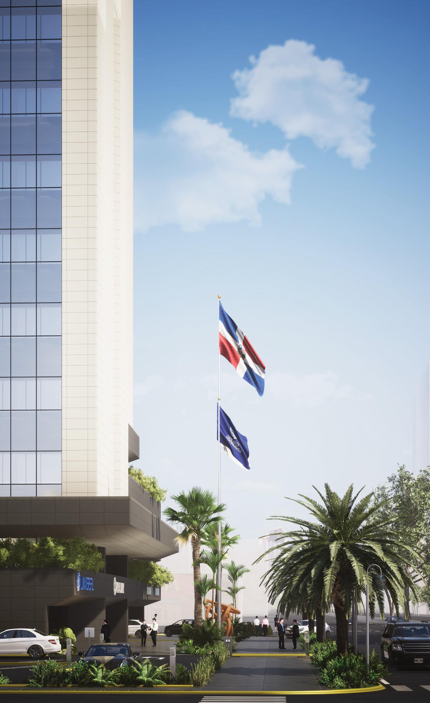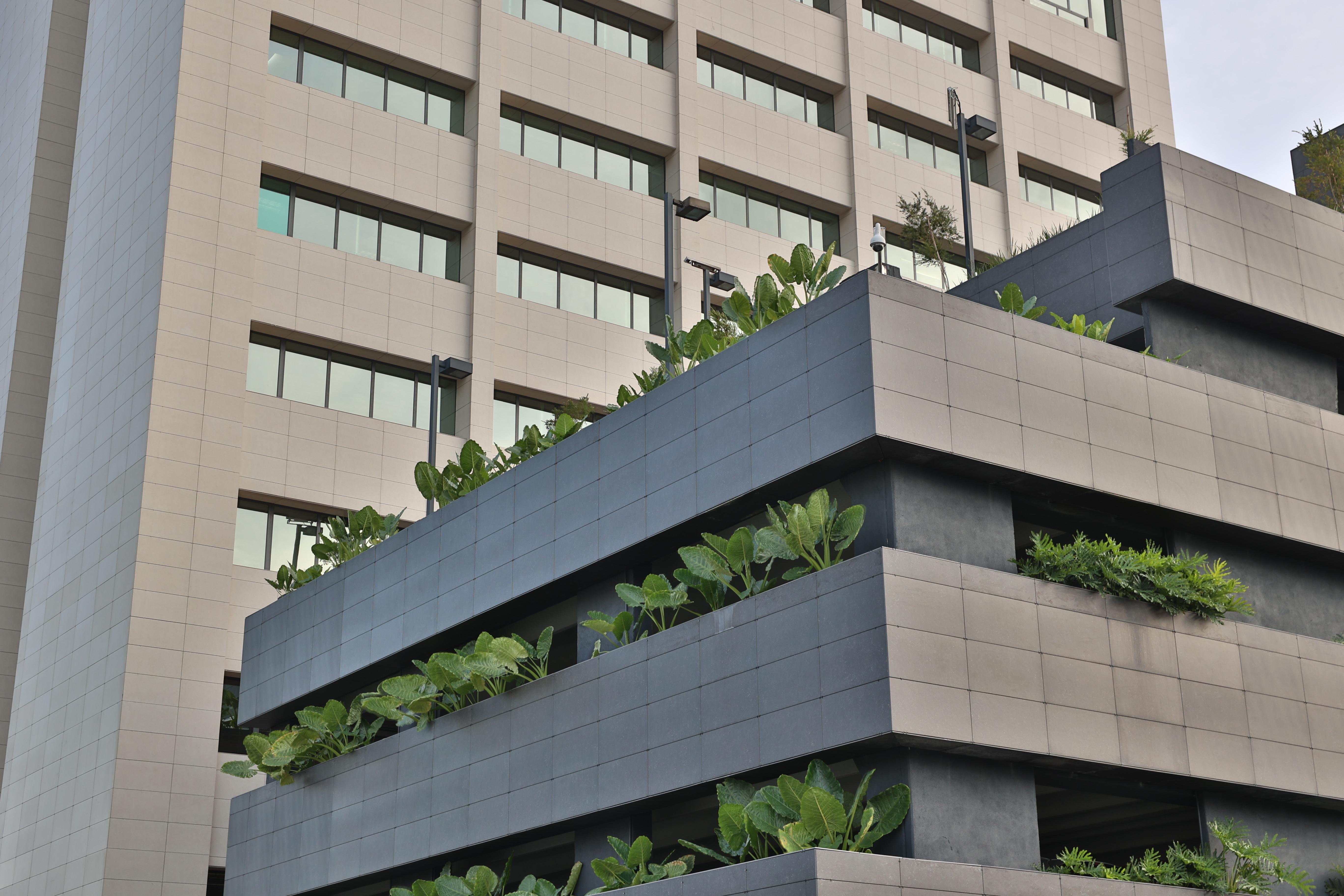 Contamos en la situación actual con el volumen del edificio de estacionamientos en la esquina nordeste del conjunto que aprovechamos para presentar una arborización más densa y tupida, creando un jardín en altura sembrado de manera copiosa y abundante en elementos con trazado horizontal que ahora unirán este volumen para aterrizar la torre y complementar su altura con una huella más importante que desde la calle y para el peatón y conductor da unos volúmenes dinámicos e imponentes que doblan la esquina de la calle Polibio Díaz y se transforman en otra escala en una pared verde para esta calle secundaria.