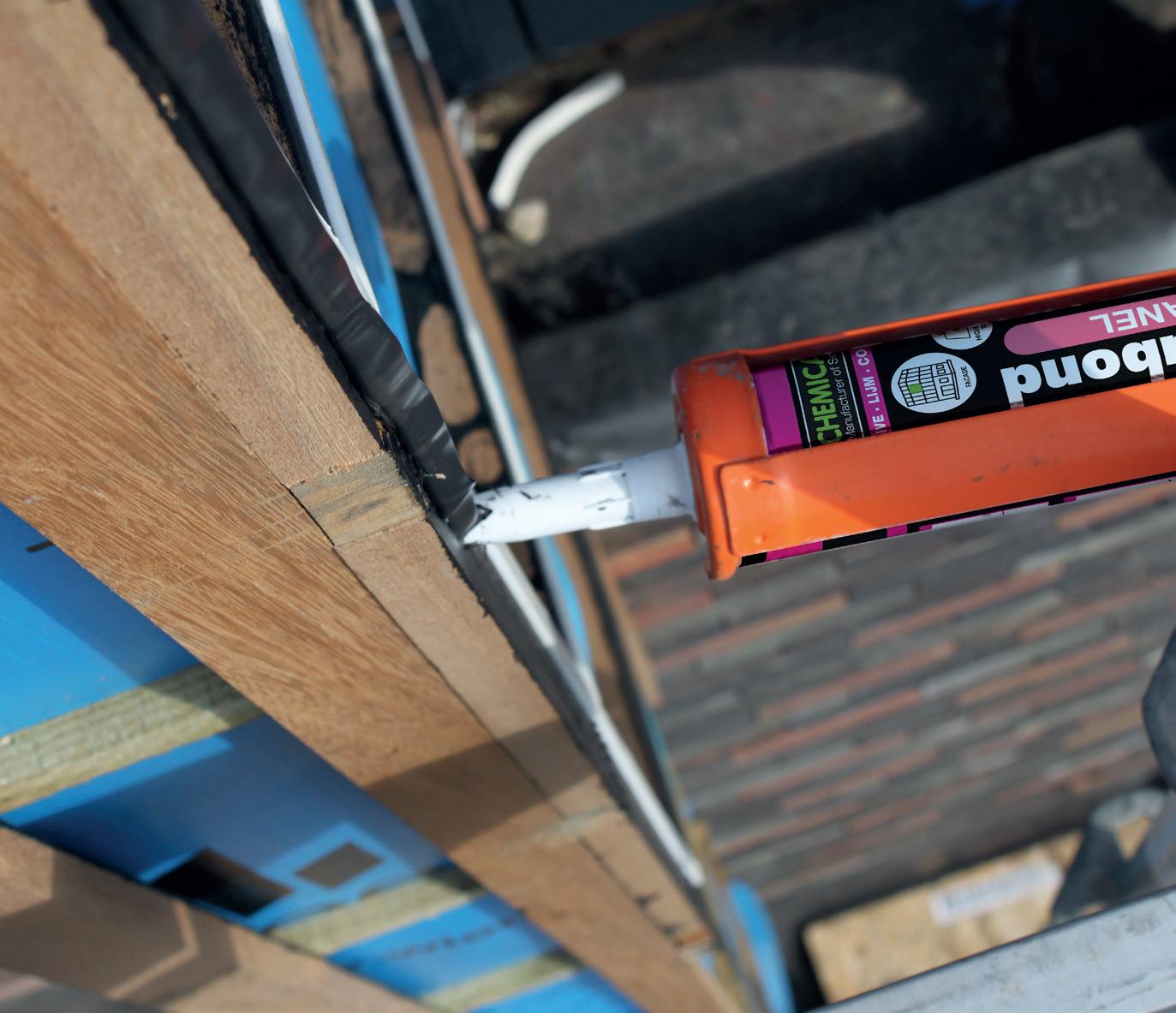 On the vertical substructure (wood or aluminium), in a vertical, uninterrupted V-shaped bead of 9×9×9 mm, approximately 1 cm from the tape.