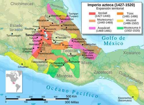 Los mexicas, una tribu nómada mesoamericana, se establecieron en México-Tenochtitlán alrededor de 1325, ubicada en la actual Ciudad de México. Desde allí, expandieron su dominio hacia estados como México, Veracruz, Puebla, Oaxaca, Guerrero, Chiapas (costa), Hidalgo y parte de Guatemala, aprovechando diversos ecosistemas y recursos naturales. En el siglo XVI, bajo el gobierno de Moctezuma II, los aztecas controlaban la región, convirtiendo el náhuatl en la lengua dominante en Mesoamérica.