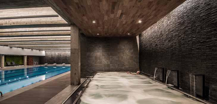 The club spans 3 levels, featuring multiple programs – from boutique studios such as Yoga, group fitness, multimedia spinning, boxing and personal training field with rooftop workout areas – to custom amenities such as a signature restaurant, indoor/outdoor pools, Mind & Body suite, spa, salon and retail. A grand staircase from the lobby leads guests to the hub of the Midtown community, arriving at a large open “landing pit” with comfortable seating, contemporary built-in fireplace and access to the restaurant, outdoor pool and fitness areas. Where fitness is a small amenity to the standard hotel, the Hotel at Midtown flips the paradigm and serves as an amenity to the high-end club. The 55-key Hotel towers over the Club in a glass volume and provides active travelers an exclusive fitness experience and brings a high-end lifestyle center to boutique hospitality.