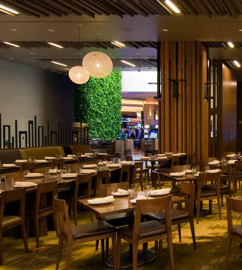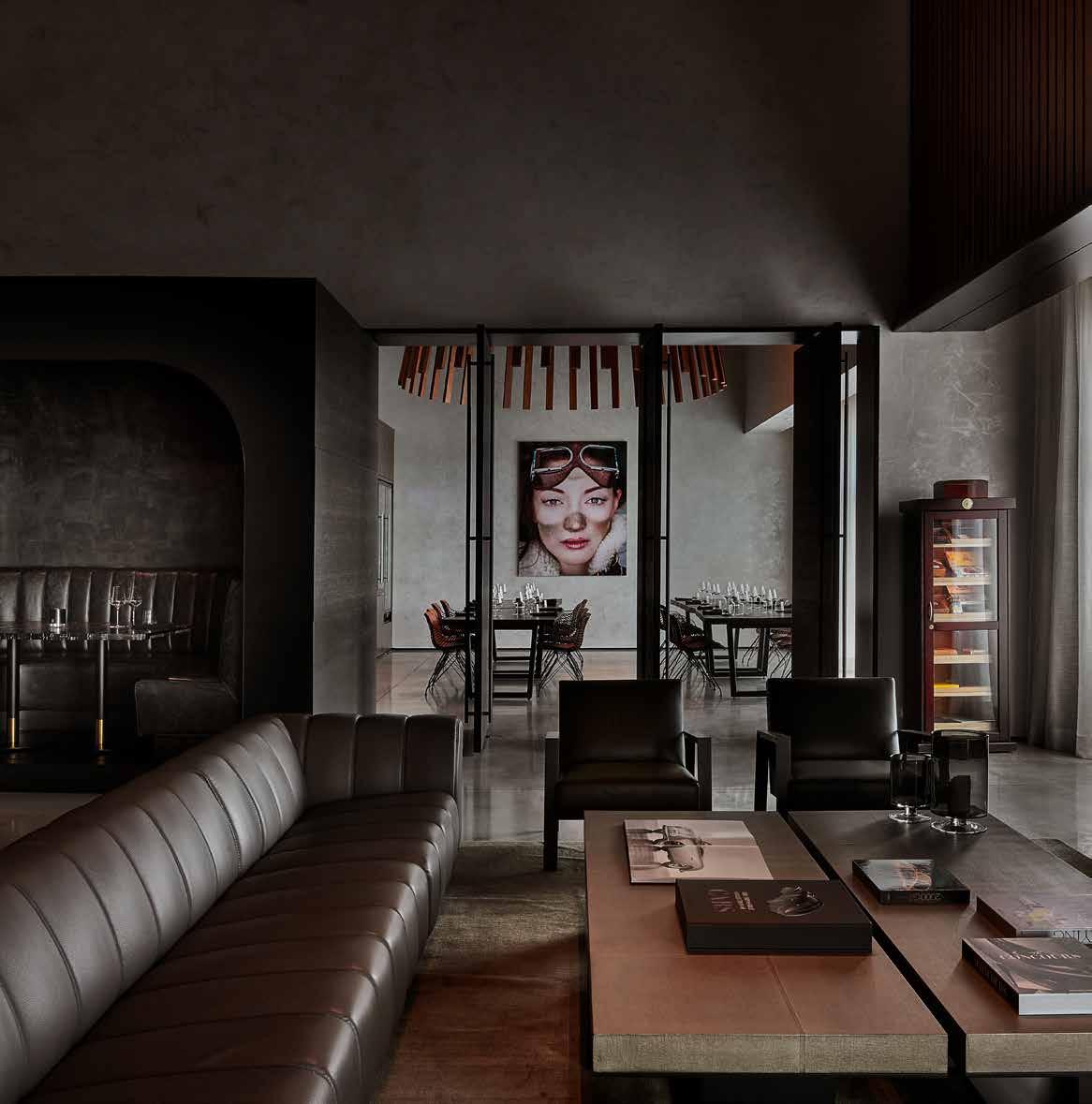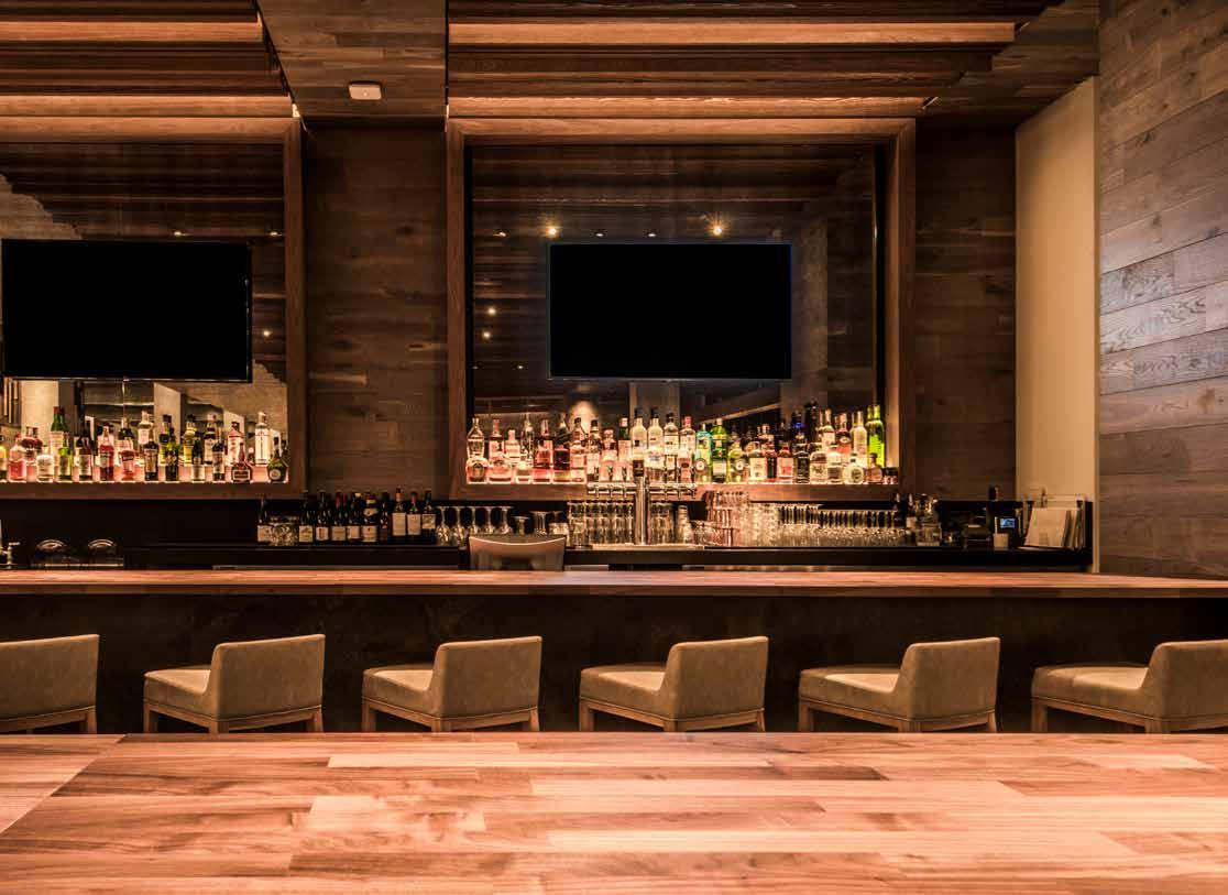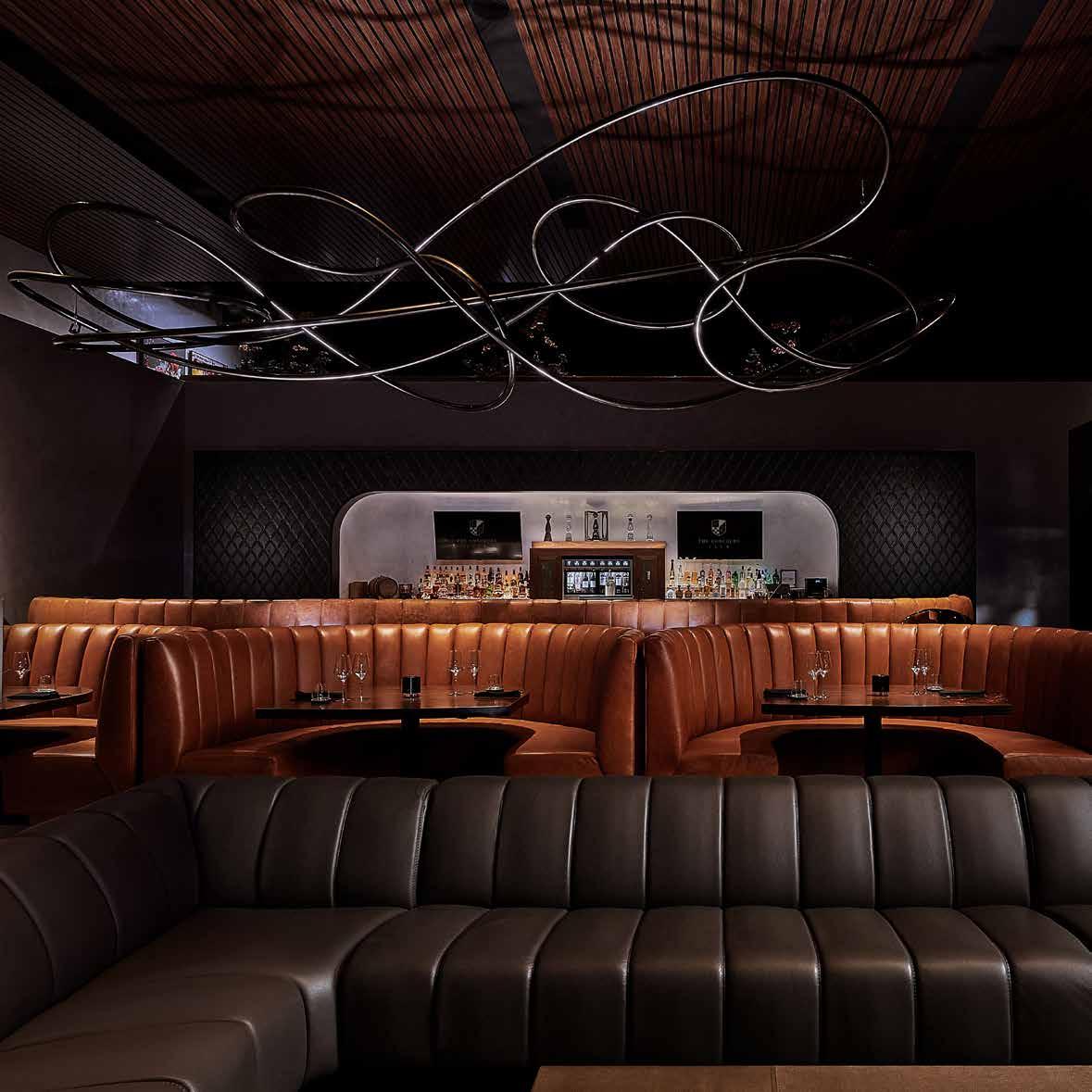 Chromium is located at the heart of the club on the main fitness floor. It is visually and functionally an extension of both the spacious lounge we call the “landing pit” and a large outside pool deck. From the landing pit, Chromium welcomes guests through an entryway created by a partial green wall with a subtle sign that reads “Chromium” in vintage lettering. Custom leather seating mixes traditional dining with lounge seating and is paired with solid wood tables for chic comfort. Natural light floods the dining room through a wall of glass with a views of the outdoor pool and cafe. At one end is the full-service bar with the kitchen behind it. At the other end is an elegant private dining room with custom wood finishes and cabinetry.