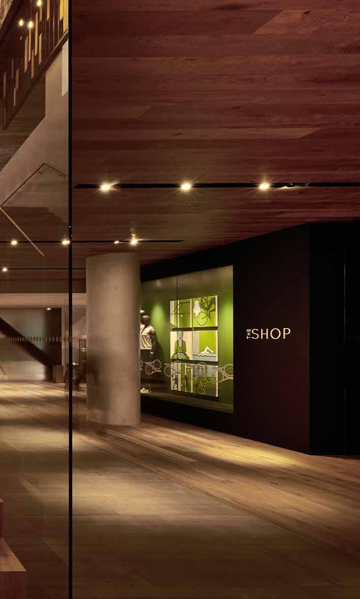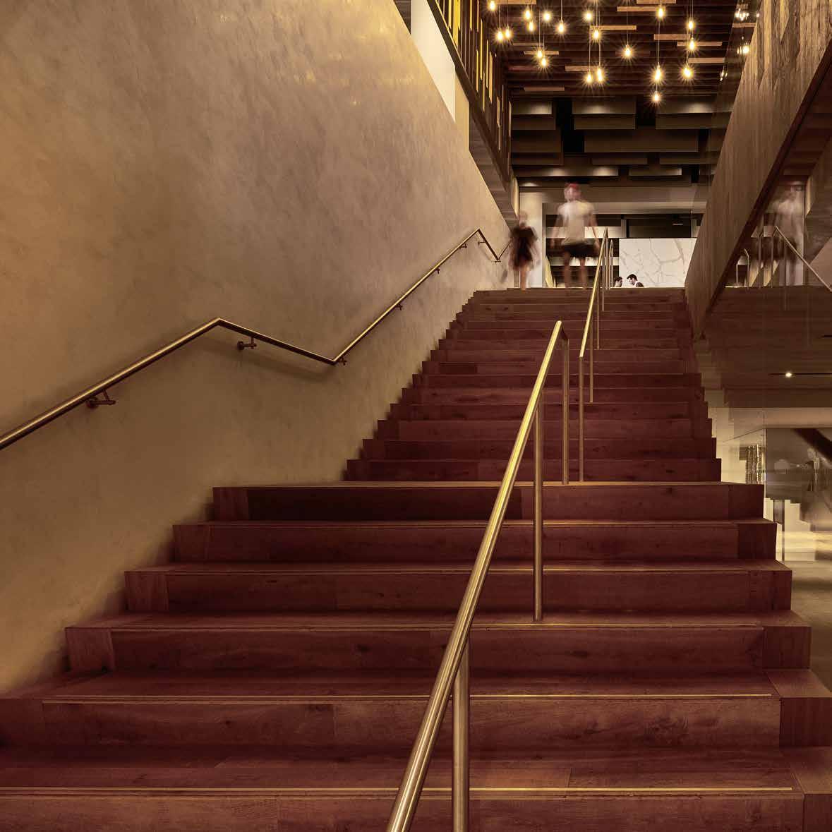 A 40-foot trellis soars over the monumental stair at Midtown, visually choreographing movement through the space and guiding guests upward from the reception lobby to a landing “pit” which is the communal hub of the club. This trellis is designed to honor famed tennis club that stood in the very location, a large portion of which was demolished to make room for the new expansion. The metal trellis is infilled with panels of copper and oak salvaged from the original club prior to demolition.
