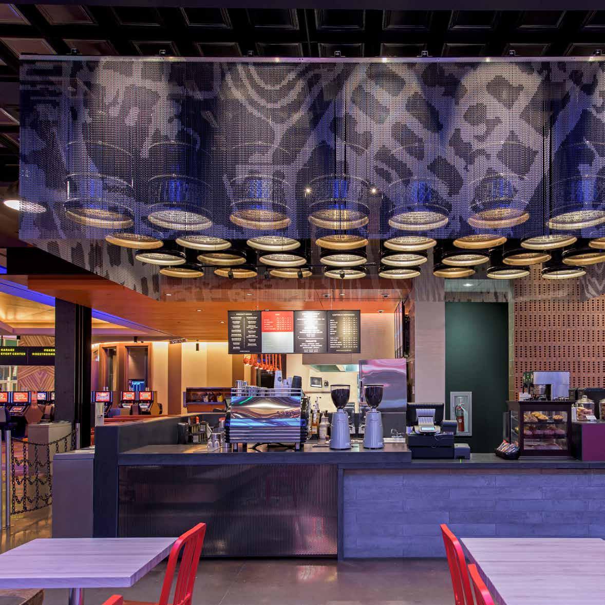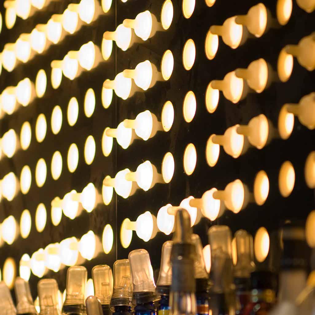 Mind & Body’s spacious relaxation lounge is where the mood dramatically changes, mentally preparing guests for Yoga or Pilates. In a dim room padded with warm blue-gray upholstered acoustic wall panels and a long bench, a constellation of tiny stars sparkle above and behind a Buddha statue sitting in a meditative pose. The “stars” are perforations of specific sizes in the ceiling panel for measured brightness, representing all of the zodiac signs. Originally, a layer of fabric was planned to cover the perforations to diffuse the LED strip light source. But during installation, we discovered the sparkle effect was stronger without the fabric and decided to eliminate it. The lighting completely transformed the lounge to other-worldly.