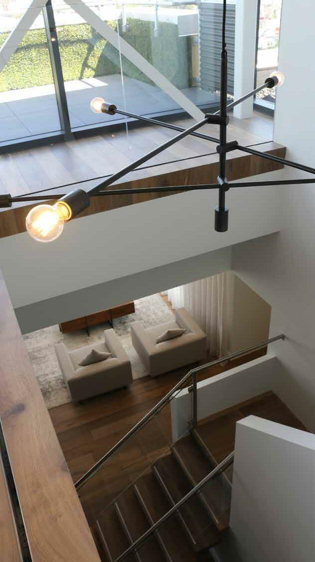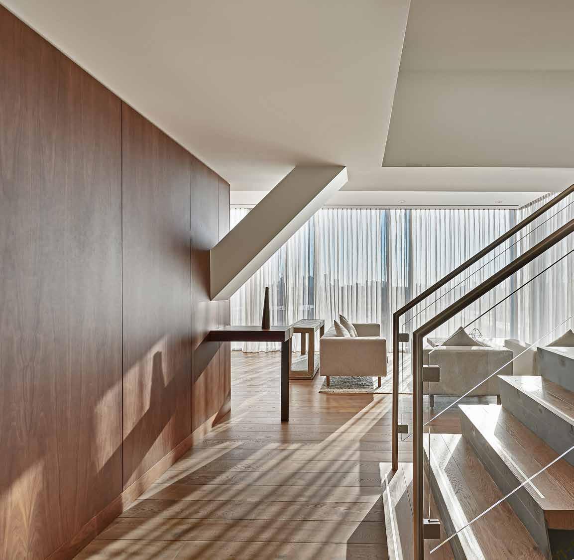 The 2,100 square foot, two-story corner Penthouse Suite is flooded with natural light and opens to iconic views of Chicago’s skyline. Entering into a double height space dominated by a sculptural staircase made of folded steel plates and pipe stringers, a serene volumetric space welcomes guests. With generous 9’-6” ceiling height, the living and dining areas merge with the capacity to seat up to 10 people. To the left, a volumetric glass insert encloses a kitchenette and an adjacent gathering space. To the right is the 530 squarefoot master bedroom with a king sized bed, walk-in closet and a 170 square-foot bathroom that includes a double marble countertop, built in bathtub, and double shower. Upstairs, a 500 square-foot lounge room opens to a private outdoor deck, resulting in a versatile space that can double as a place for relaxation or for a memorable event.