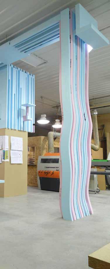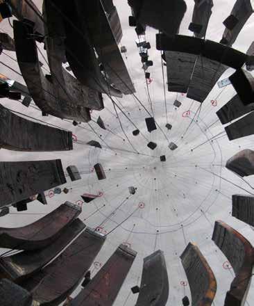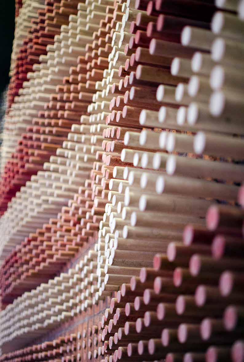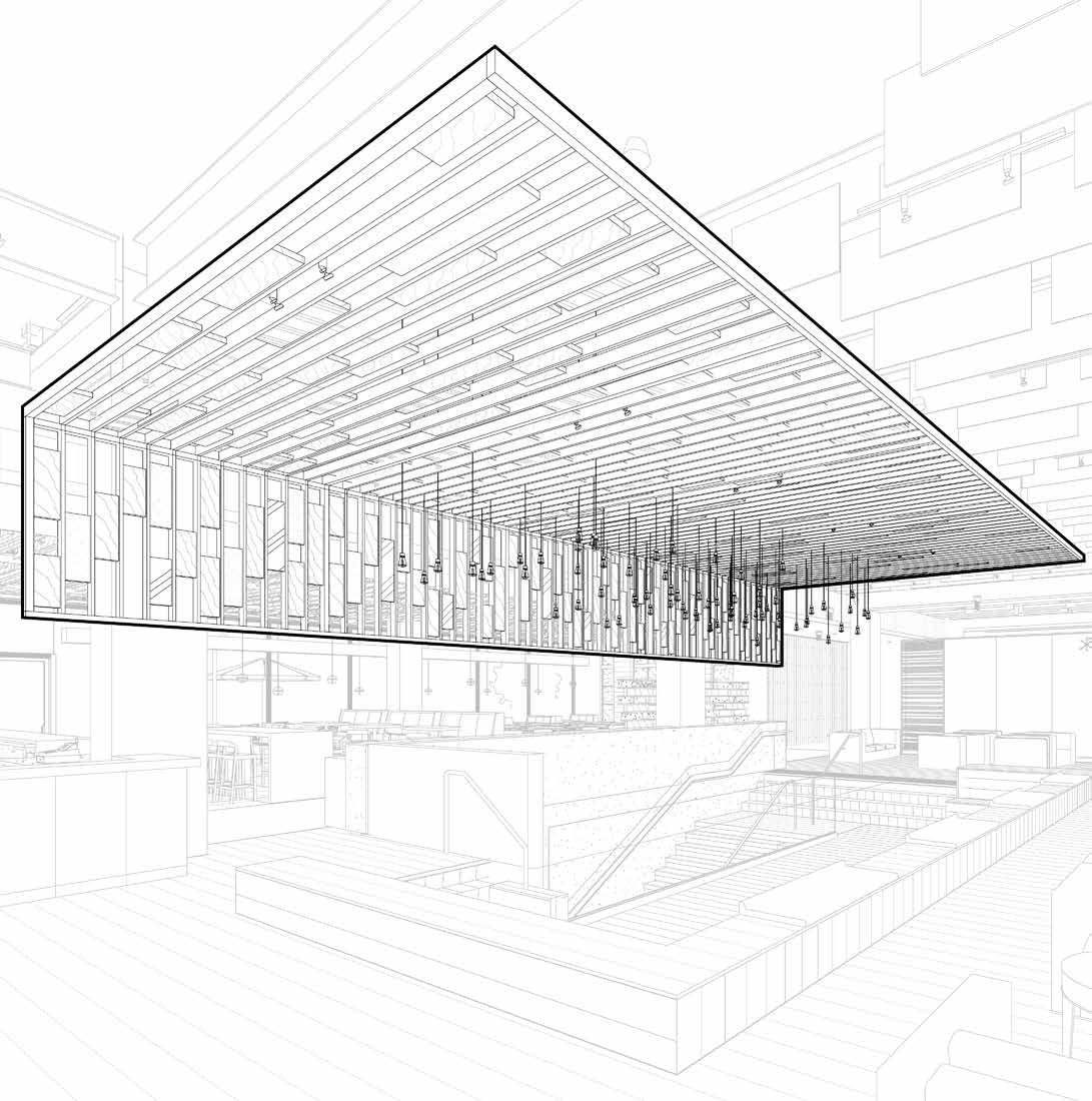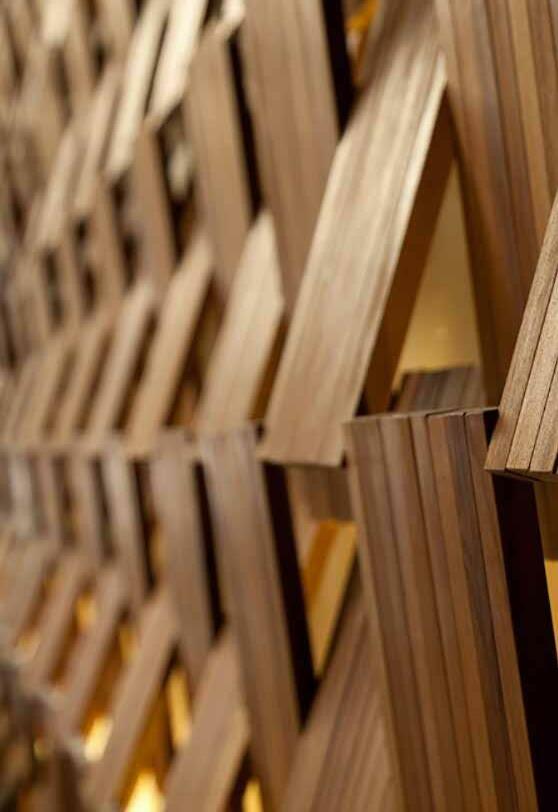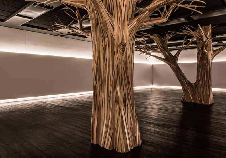 A Bodhi or Wisdom Tree in Buddhism represents the place of Buddha’s enlightenment. Inspired by the symbolism, the steel columns and bracing were clad in strips of repurposed plywood, dressing the trunk in up to six different wood species to provide layering and texture. Branches naturally grow out into limbs, stems and twigs for a delicate balance in space, blurring the boundaries between art and architecture.
