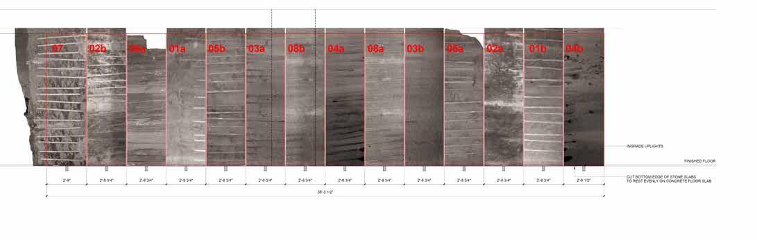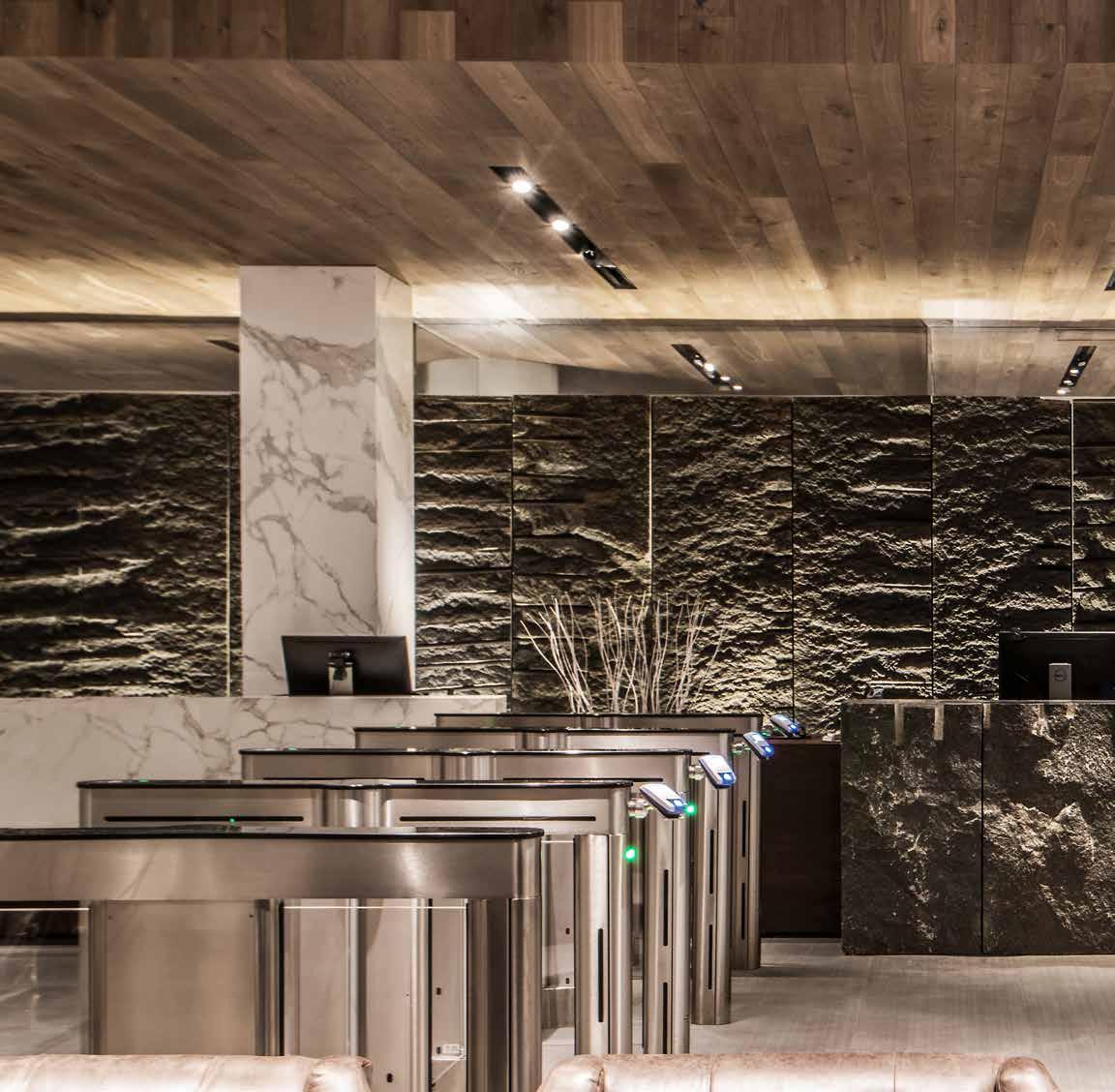 Carefully selected blocks split from mountains were cut into panels that varied in thickness from 2 to 14 inches. The installation into an already finished space required engineering a support system for the stone panels. In total, fourteen panels weighing 15 tons were carefully selected and planned from the design vision that spanned and bridged geographical boundaries. Completing the lobby space, a 10 ft reception desk of the same granite end blocks was hand carved for the milled wood desk nested within.