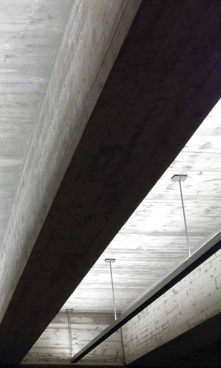 This concrete ribbon, along with the exposed ceilings and beams on the first floor that houses a 100 ft long indoor swimming pool was cast in place using board forms. Pine boards in two widths, 1x6 and 1x8, were the forming material of choice and these boards were painstakingly choreographed to represent an 8 foot module with a repetitive Fibonacci pattern. Joints were staggered with a minimum overlap of 24 inches. All structural cold joints were coordinated to align with the board joints. Mock ups were tested to arrive at the right color, consistency, curing and stripping techniques, that resulted in a rich concrete texture with a subtle grain pattern on the finished face.