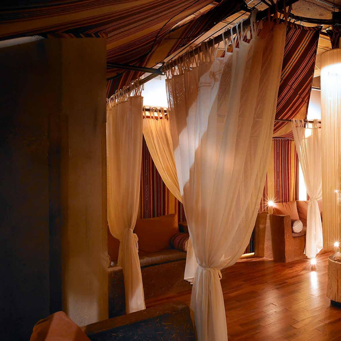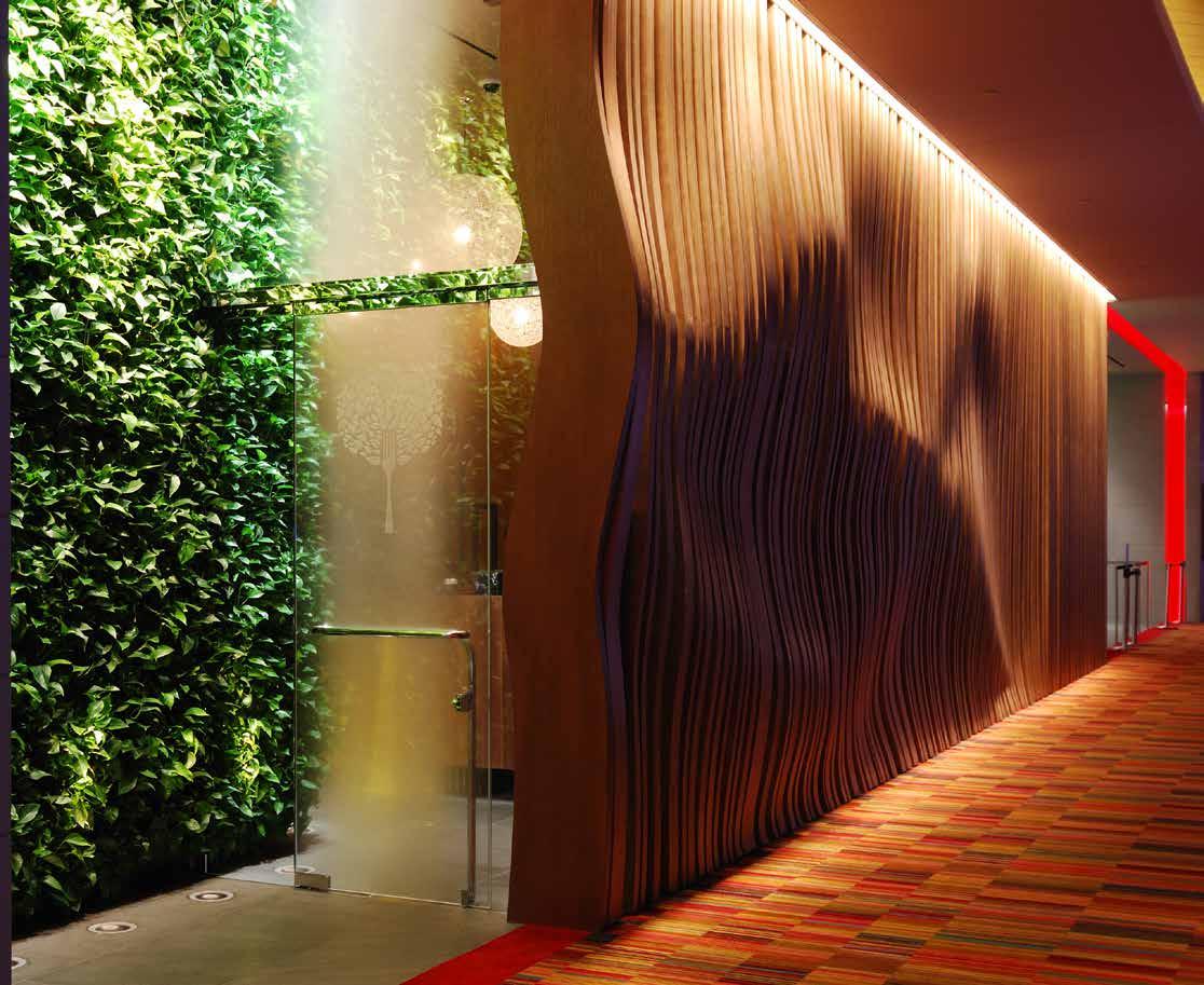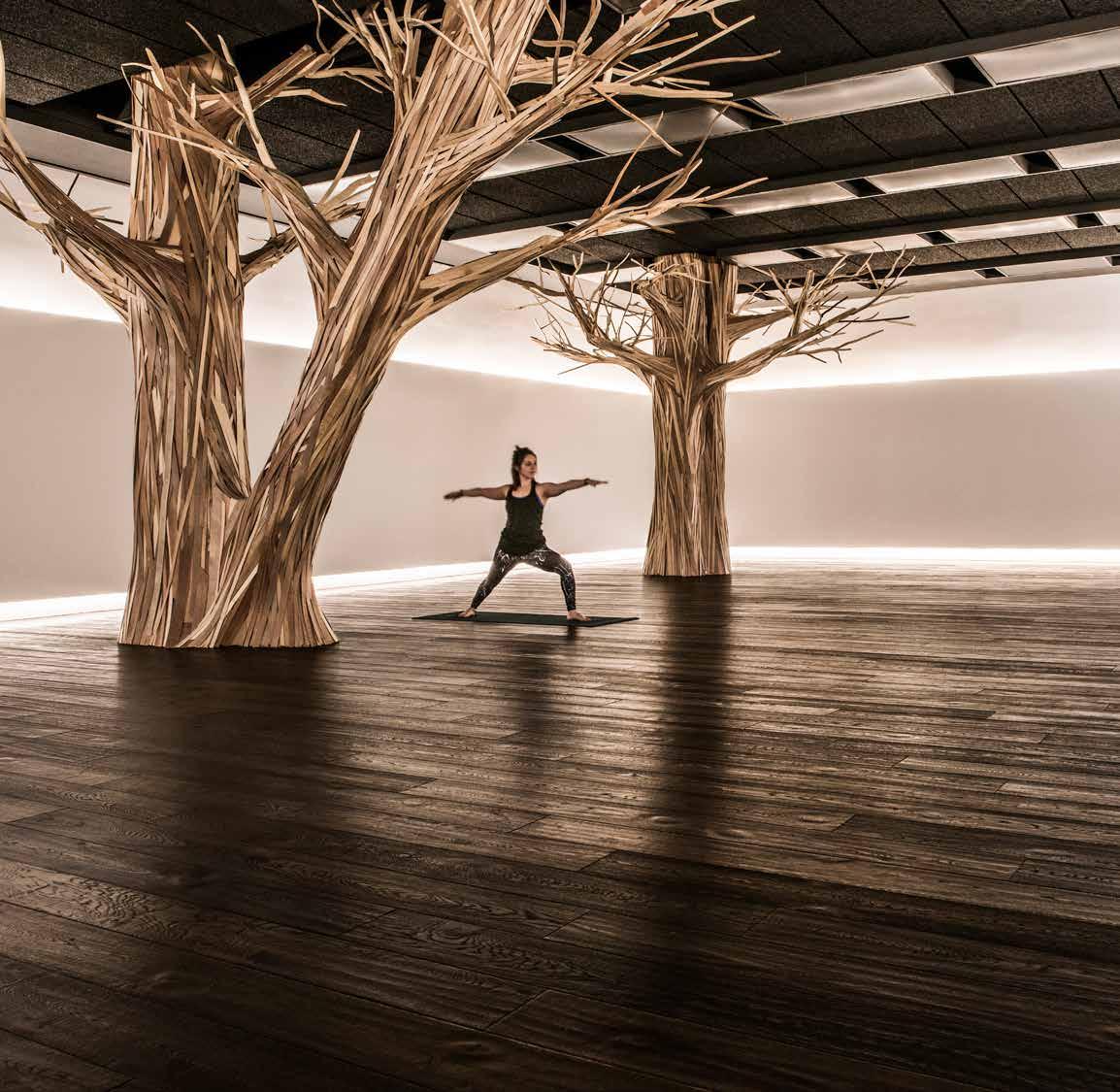 The Yoga studio is a mystical place. The walls float with indirect lighting above and below, creating an aura of timelessness, and the Bodhi Trees take you to another world. With a quiet presence, the trees settle the mind and fade into the space.