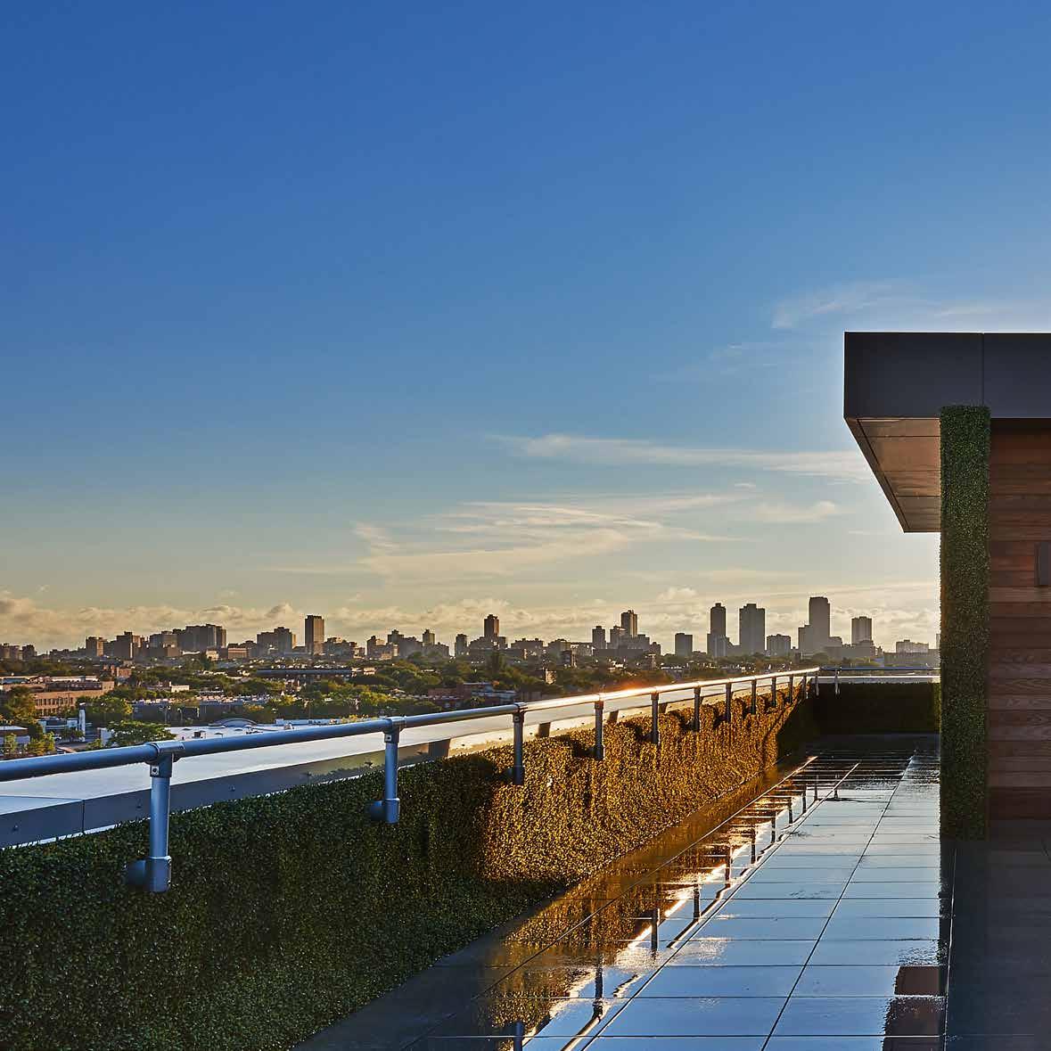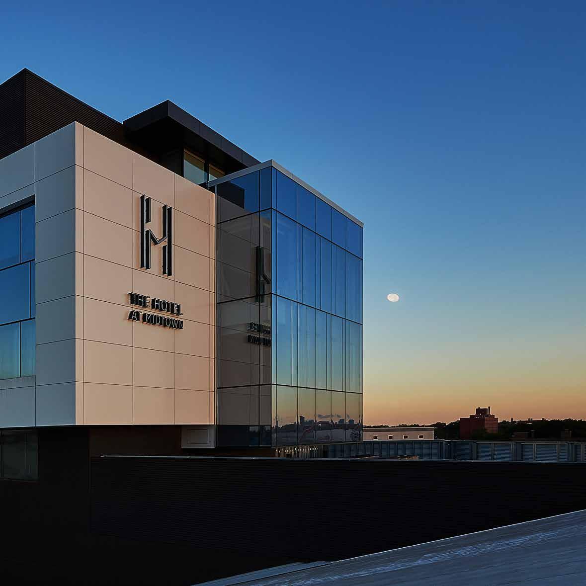 Where fitness is a small fraction of the typical hotel, the Hotel at Midtown flips the paradigm allocating 94% to health club and 6% hotel where guests have all of the perks of Midtown Athletic Club. In a 35,000 square-foot, two-story reflective glass volume above the health club, the Hotel at Midtown is located on the 4th and 5th floors with the most spectacular views of Chicago. There are 51 guestrooms, three deluxe suites, a two-story penthouse, two meeting rooms, a board room, and a rooftop event space. Despite the difference in program, finishes from the health club are brought into the guest rooms to provide a cohesive experience.