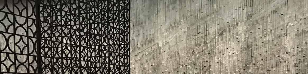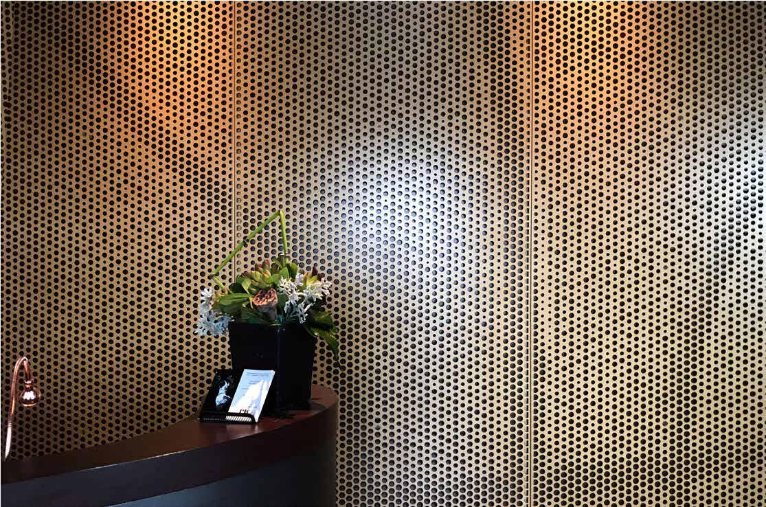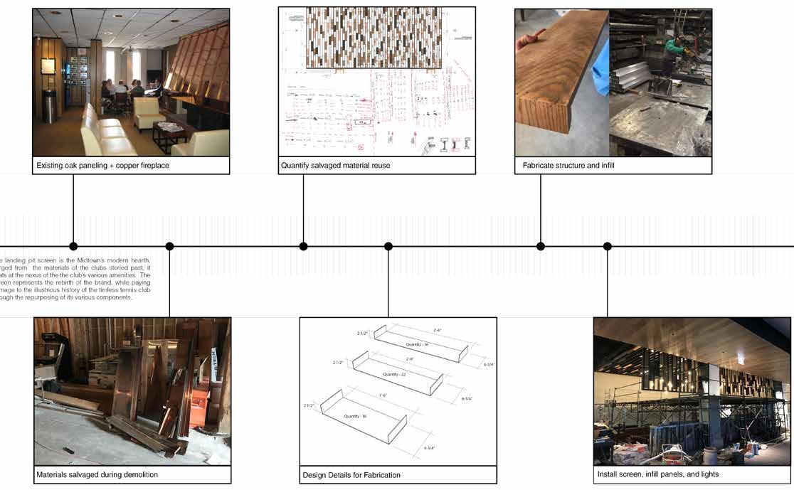 The idea of the trellis was born from Midtown’s history. Oak panels that once lived in the locker rooms of this iconic club frequented by revered professionals like Andre Agassi and John McEnroe, were reclaimed, refinished and cut for infill within the new trellis. Copper panels from the original fireplace hood were also salvaged, cut and folded to fit within the metal screen. The two repurposed materials were arranged in a harmonic pattern like jewels and interspersed with traces of bronze mirror used as additional infill material symbolically representing a “reflection” of the past in the new.