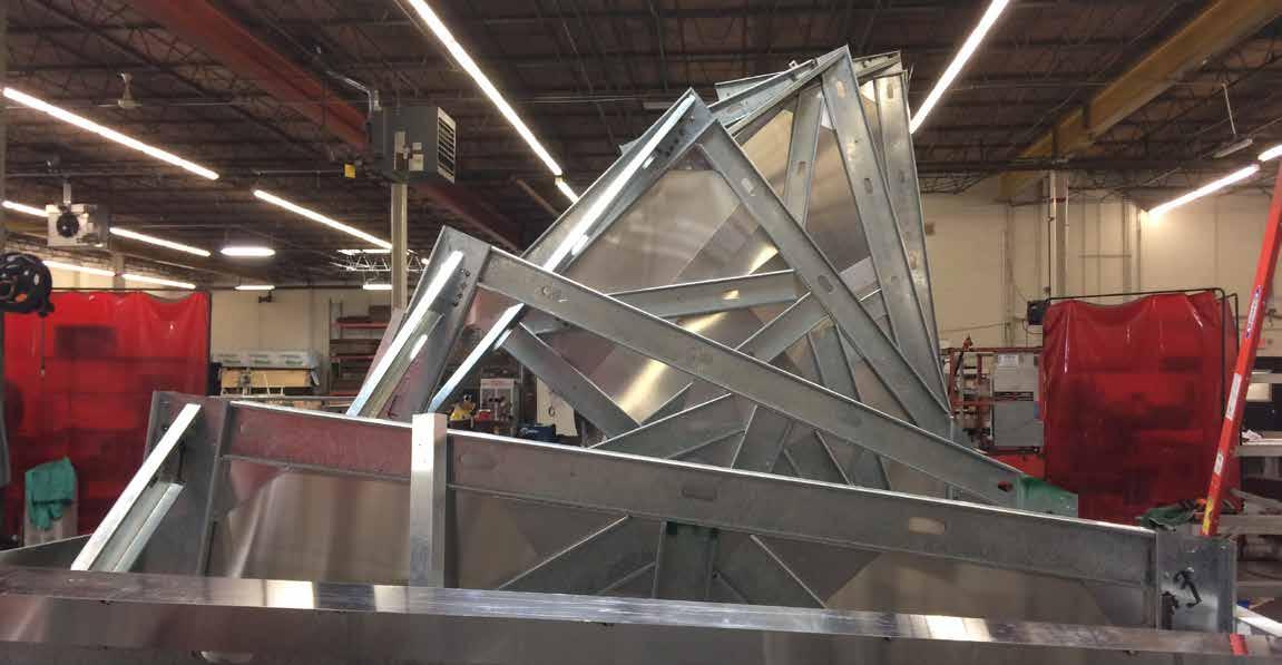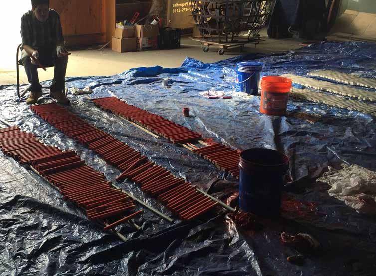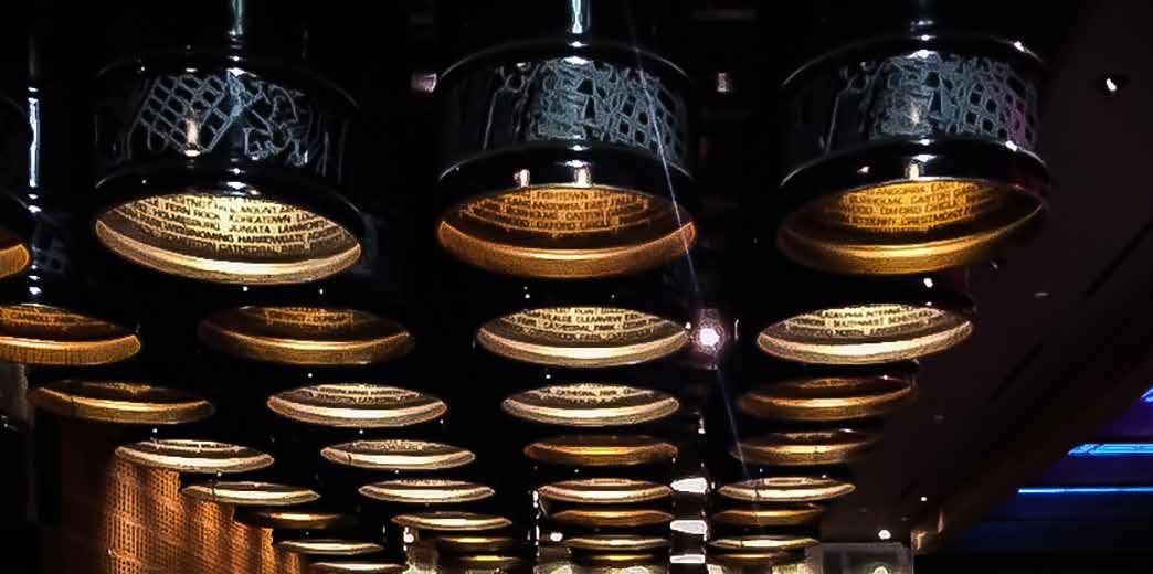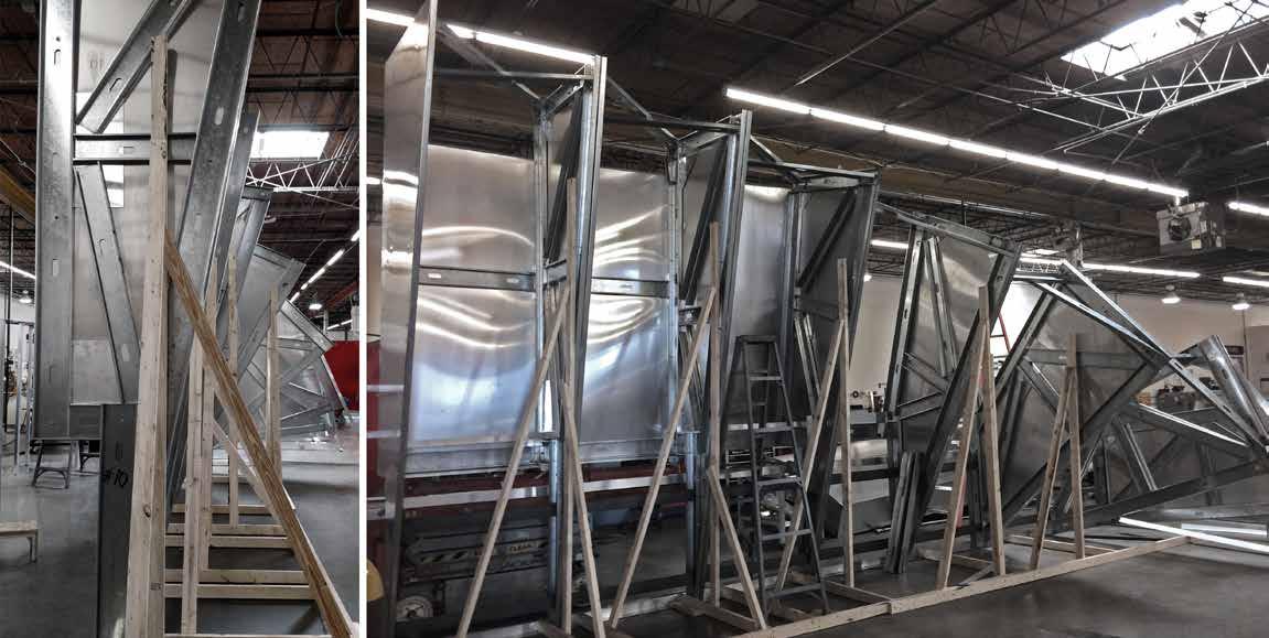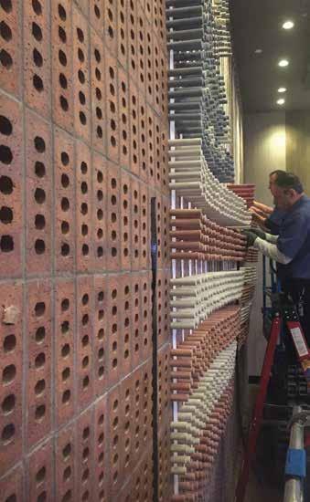 The custom fabricated trellis screen is 40 feet long, 20 feet wide, fabricated in 8 foot modules and installed on site with all bolted connections. An elaborate scaffolding was erected for the installation, and structural hang points were located on site to suspended the 5000 lb frame from the ceiling structure. Seventy Edison lamps are suspended through the gaps of the trellis and reflect up on the mirror and copper infills, providing a sense of lightness to this massive trellis while paying tribute to the storied history of the timeless tennis club.