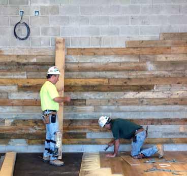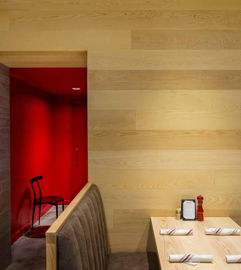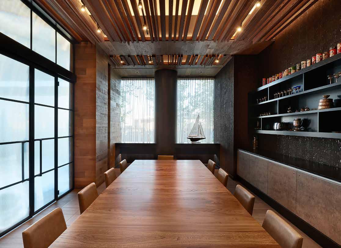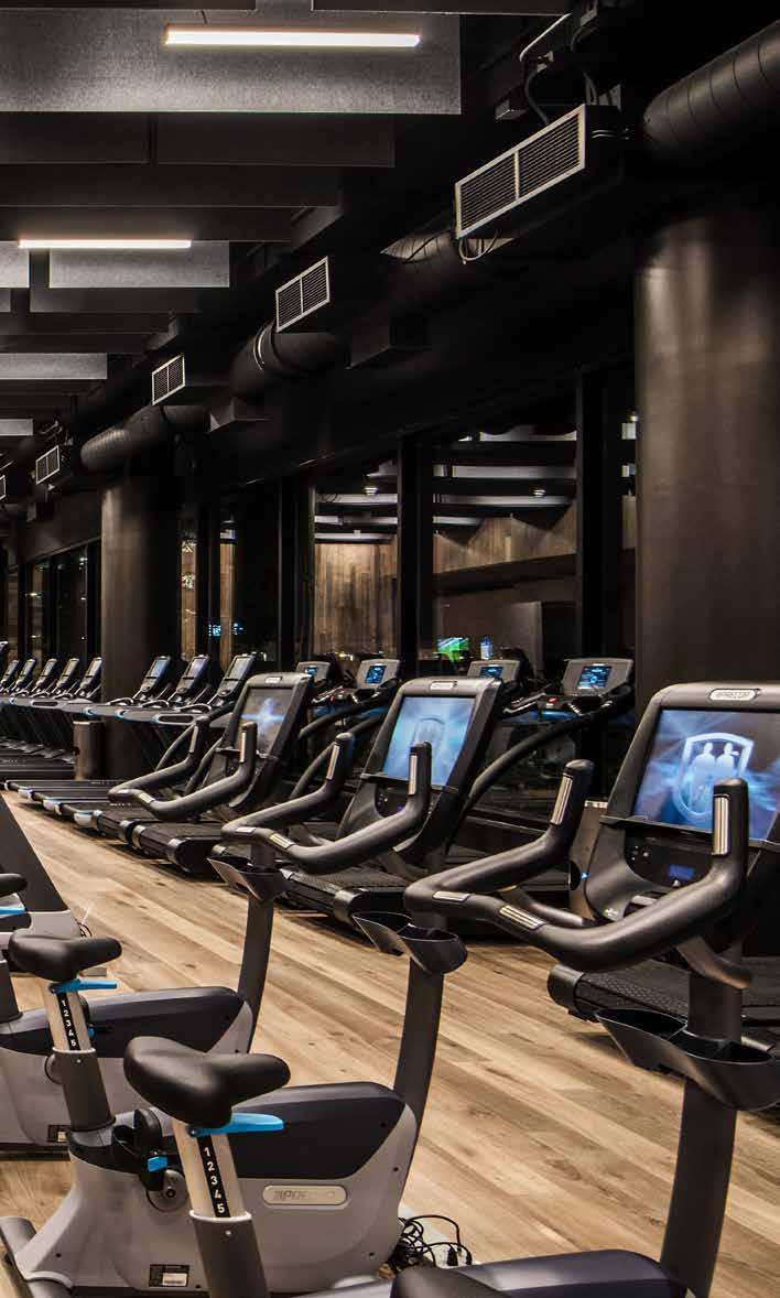 Keeping with the overall design philosophy of “Honesty of Materials”, the design team embraced the texture and inconsistent coloring of the salvaged boards (with fire retardant coating) and clad majority of the expansive fitness floor with it, that it became an archetypal expression of the club.