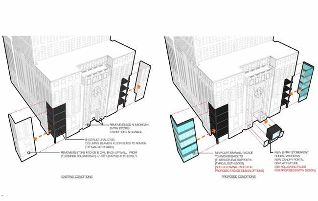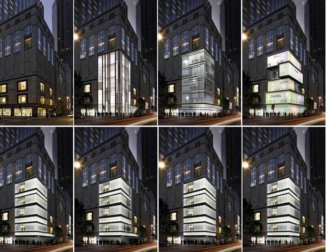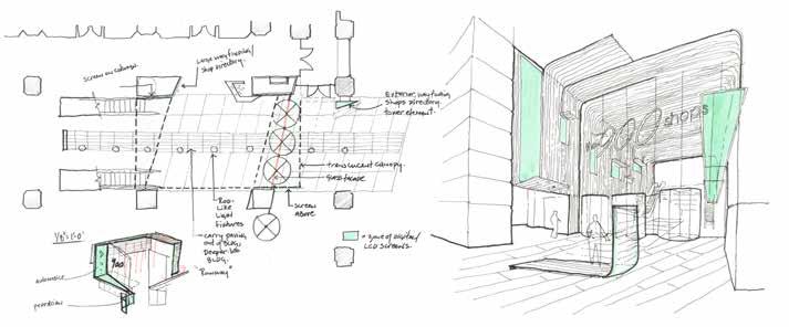 The existing façade at 900 Shops cloaks interior activity, and does not engage the pedestrian from Michigan Avenue. We explored various ways to reveal the internal streetscape and further allow a “seen” or “be seen” connection with the street. By extruding select storefronts beyond the existing lease-line to the zero-lot line, there is a stratification and mixing of the old with the new. The space begins to have density, defines the street experience, and creates a desire to travel vertically. What does it feel like to move between spaces? How can these elements be signifiers that enhance the experience? To transcend the typical high-end mall experience, all architectural and interior components had to serve the street where the “why” is felt in every detail.