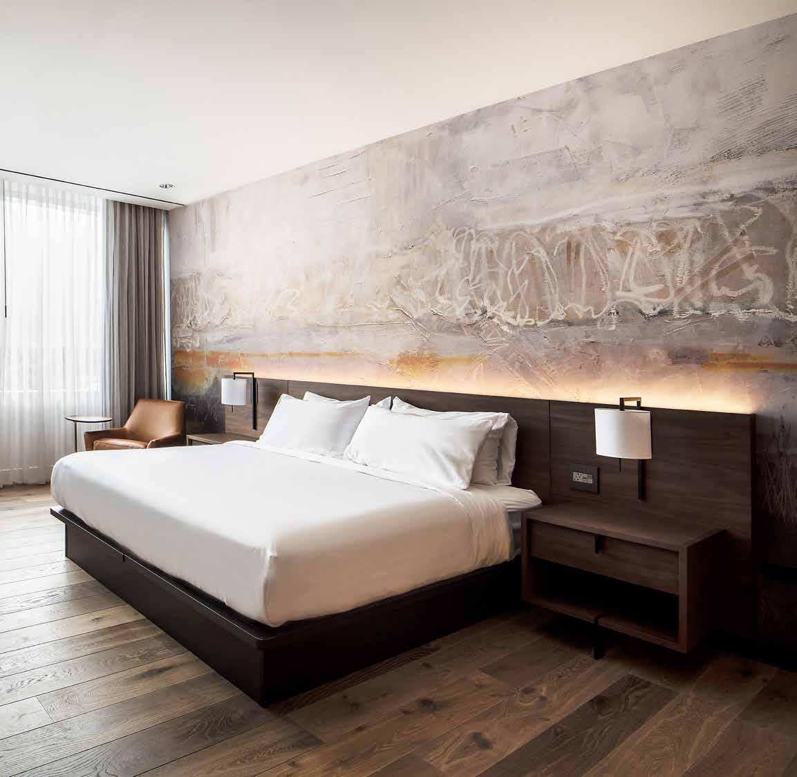 With relaxation and ease in mind, guest rooms are spacious and detailed with custom furnishings and finishes. From the foyer, city views are perfectly framed by walnut panels. Warm hardwood flooring extends into the bedroom where a long walnut desk is delicately supported by a thin vertical frame with a built-in robe hook that also serves as a doorstop. The bed rests against a wall covered in floor to ceiling custom wallpaper, like an abstract painting reflecting the urban context and lit for radiance and warmth.