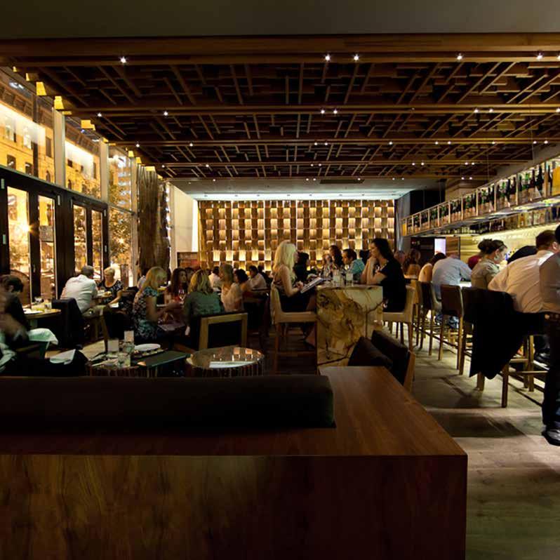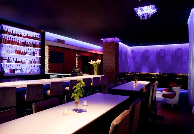 The restaurant transitions from a modern casual restaurant to a DJ hosted nightclub every evening. The space was programmed with no “threshold” to the bar so that no matter where you are in the space you can participate in the energy of the bar. An elevated dining area above the main space functions as both a stage and as an ultra lounge. Although modern in spirit, the materials and design elements used throughout are both familiar and unexpected in there execution. All the elements including colors and sound come together in a kinetic space that is indeed hip and cool.
