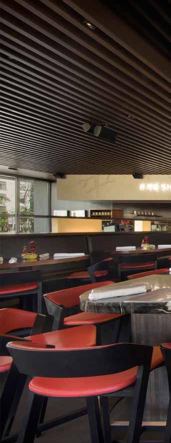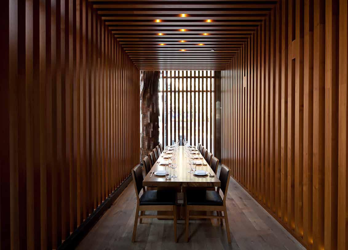 For BellyQ, the goal was to create a space that was an extension of Chef Kim’s private home: calm, luxuriously understated, natural and modern. What they achieved is a purity of design that flawlessly supports the real star of the show – Chef Kim’s food. Among the restaurant’s many features are a full bar, BQ2GO area, built-in hibachi grille tables, a large flexible dining space, bar lounge seating and a separate private area which includes a karaoke room. Subtly nestled along the street, the building injects a new level of energy into the neighborhood. Upon entering one might feel like they’ve walked into a minimalistic garden, with everyday materials like hand-troweled cement, industrial wool felt, Baltic birch plywood, and brushed steel acting as main characters. Everything in the interior is designed to provide a visual hum to an atmosphere of casual luxury. This is a space to congregate, but not feel closed in or crowded. A space to feel comfortable in while enjoying Chef Kim’s dishes, as if eating in his home.