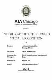 2018 AIA Chicago Design Excellence Award Midtown 2018 AIA Chicago Divine Detail Award Landing Pit Screen 2018 Chicago Building Congress Finalist Midtown 2018 Crains Chicago Business Best New Event Space Midtown 2017 Chicago Reader Finalist Best Architect 2013 AIA Chicago Interior Architecture Award Anthony Cristiano Salon
