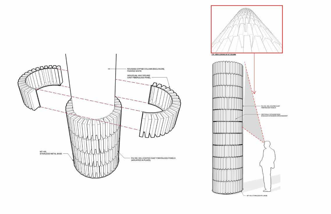 Initially designed to be a 3-story building, the Midtown Athletic Club’s program evolved during construction adding two more floors. The decision required a change from concrete structure to steel framing with diagonal bracing that would support the taller building. As a result, two columns and a diagonal brace were embedded within the Yoga space, forcing architects to come up with a solution to this new challenge. How to transform these intrusive structural elements into a meaningful design feature?