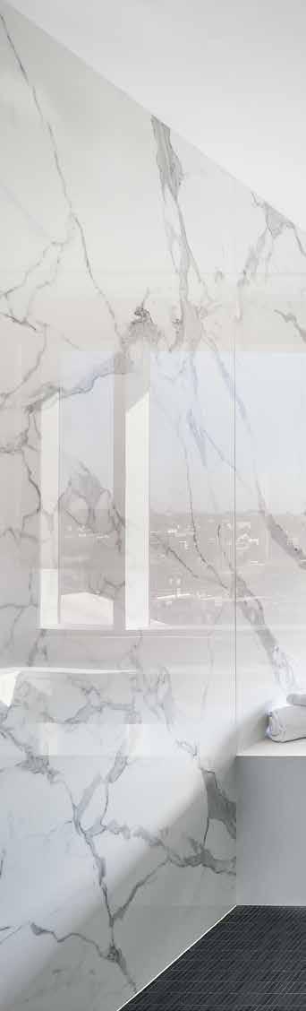 The bathroom entrance is framed by the two wardrobes but blends as one “landscape” when the walnut sliding door is closed. In the bathroom white marble tiles are carefully sequenced so the stone grain continues as it folds from one panel to the next; and similar to the desk, a thin metal frame supports the vanity with builtin features to keep toiletries and towels dry and within arm’s length. All of the knobs and pulls are custom and ergonomic.