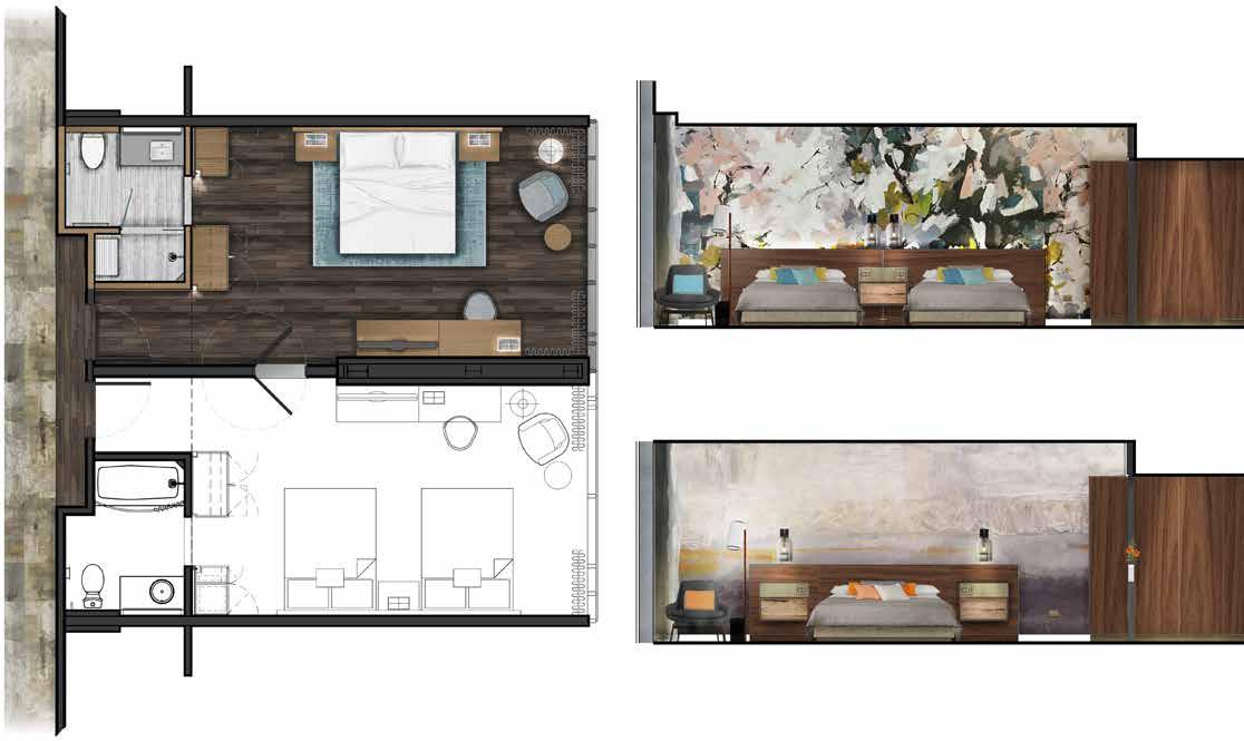 With comfort and ease in mind, thoughtful attention was given to the design of custom built-in furnishings and finishes in each guestroom for the ultimate relaxing stay. All of the hotel case goods are made of natural walnut wood appointed with black iron details, complementing the rustic and refined mood in each room.