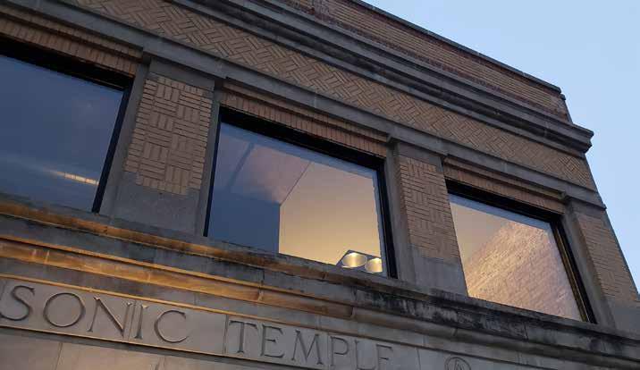 Located at a busy intersection just north of Chicago in Evanston, the former Mount Moriah Masonic Temple building is steeped in social, racial and cultural history dating back to its opening in 1929. Designed and built by Walter T. Bailey, the first African American architect to receive a license in Illinois, the two-story brick structure has a formal front. The ground-floor stone facade is engraved with the Temple’s name while the second-story is faced with a yellow-brick weave resting above the stone frieze.