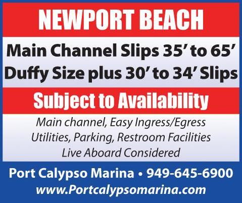 MainChannel,BalboaIslandnearthe ocean.Duffys,Sailboats,orPowerboats upto68feet.Call949-688-0299forsize availabilityandanyquestions.