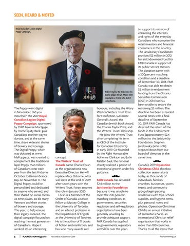 honours, including the Hilary Weston Writers’ Trust Prize for Nonfiction, Governor General’s Award, the Canadian Jewish Book Award, the Charles Taylor Prize, and the Writers’ Trust Fellowship. He joins the Writers’ Trust after completing his term as CEO of the Institute for Canadian Citizenship in early 2019. Co-founded by the Right Honourable Adrienne Clarkson and John Ralston Saul, the national charity realized a period of exceptional growth under his guidance. FAIR Canada has returned $2.4 million to the Jarislowsky Foundation because it was unable to meet the 200 percent matching condition, as governments, securities regulators and self-regulatory organizations have been generally unwilling to provide adequate support. FAIR Canada has applied to governments, regulators and SROs over the years
