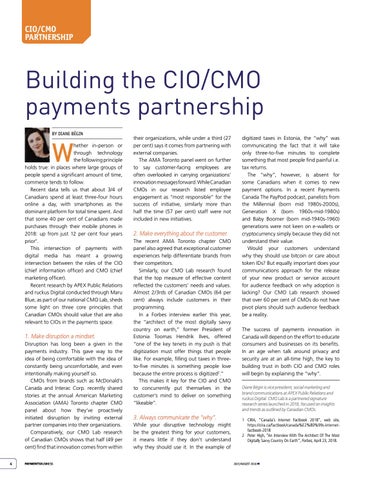 digitized taxes in Estonia, the “why” was communicating the fact that it will take only three-to-five minutes to complete something that most people find painful i.e. tax returns. The “why”, however, is absent for some Canadians when it comes to new payment options. In a recent Payments Canada The PayPod podcast, panelists from the Millennial (born mid 1980s-2000s), Generation X (born 1960s-mid-1980s) and Baby Boomer (born mid-1940s-1960) generations were not keen on e-wallets or cryptocurrency simply because they did not understand their value. Would your customers understand why they should use bitcoin or care about token IDs? But equally important does your communications approach for the release of your new product or service account for audience feedback on why adoption is lacking? Our CMO Lab research showed that over 60 per cent of CMOs do not have pivot plans should such audience feedback be a reality. The success of payments innovation in Canada will depend on the effort to educate consumers and businesses on its benefits. In an age when talk around privacy and security are at an all-time high, the key to building trust in both CIO and CMO roles will begin by explaining the “why”. Diane Bégin is vice president, social marketing and brand communications at APEX Public Relations and ruckus Digital. CMO Lab is a partnered signature research series launched in 2018, focused on insights and trends as outlined by Canadian CMOs. 1 CIRA, “Canada’s Internet Factbook 2018”, web site, https://cira.ca/factbook/canada%E2%80%99s-internetfactbook-2018 2 Peter High, “An Interview With The Architect Of The Most Digitally Savvy Country On Earth”, Forbes, April 23, 2018.