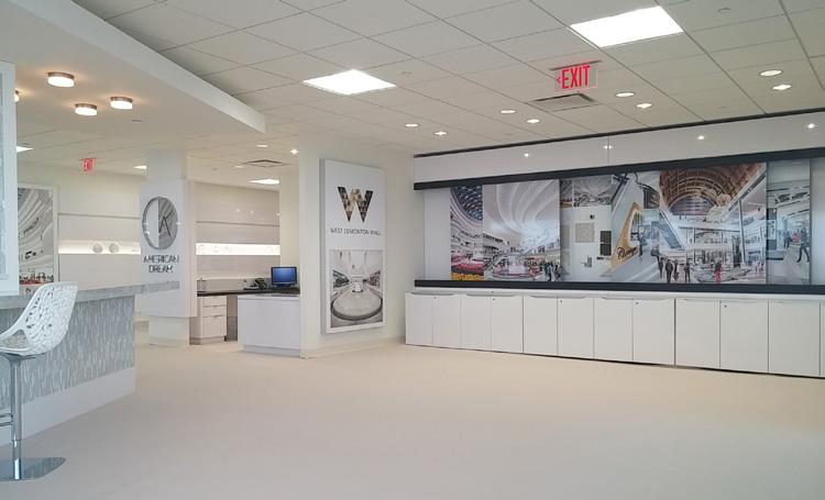 In 2014, as Triple Five, the developers of American Dream, picked up steam toward the opening of the entertainment and shopping complex, DMR was hired to design their leasing office and showroom. The 14th floor office looked directly over the project site, with design elements throughout that focused on their branding and marketed their other major projects, such as West Edmonton Mall in Alberta, Canada and the Mall of America in Bloomington, Minnesota.