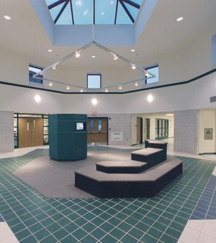 The school, which accommodates 1,100 students in grades 5-8, was based on a house plan in which grades 5-6 are located in one wing and grades 7-8 in another, with the two wings connected by a hub for administration. A third wing, attached at the rear of the building in a circular design, includes the gymnasium, technology labs and cafeteria.
