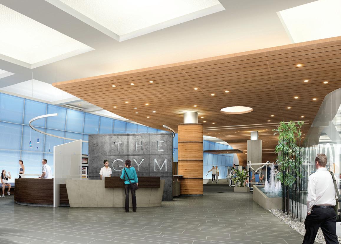 The design solution called for elements such as specialty finishes, a curved wood ceiling, a 135 foot feature wall, and fluorescent light boxes throughout the entire workout area, bringing brightness and energy to the environment.