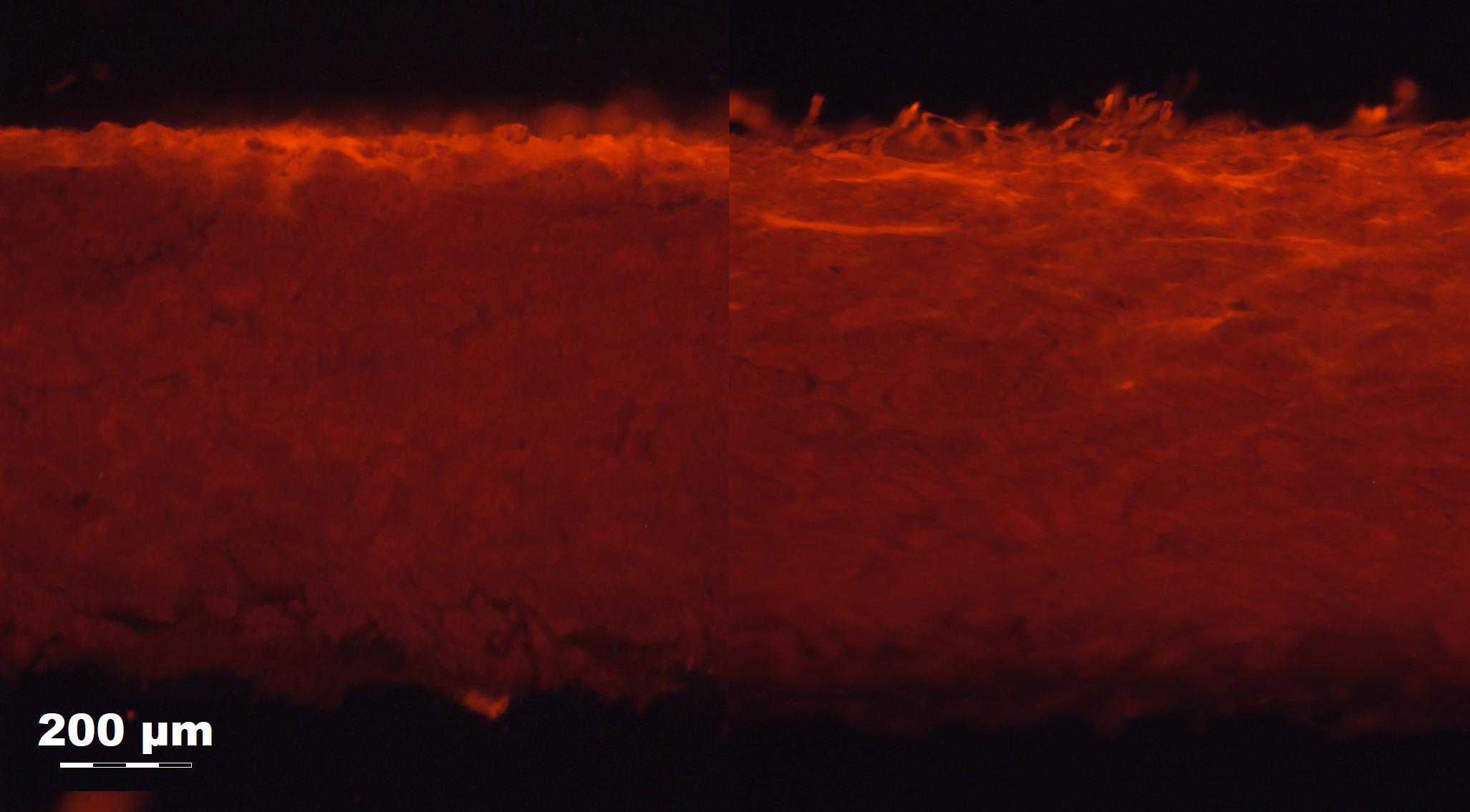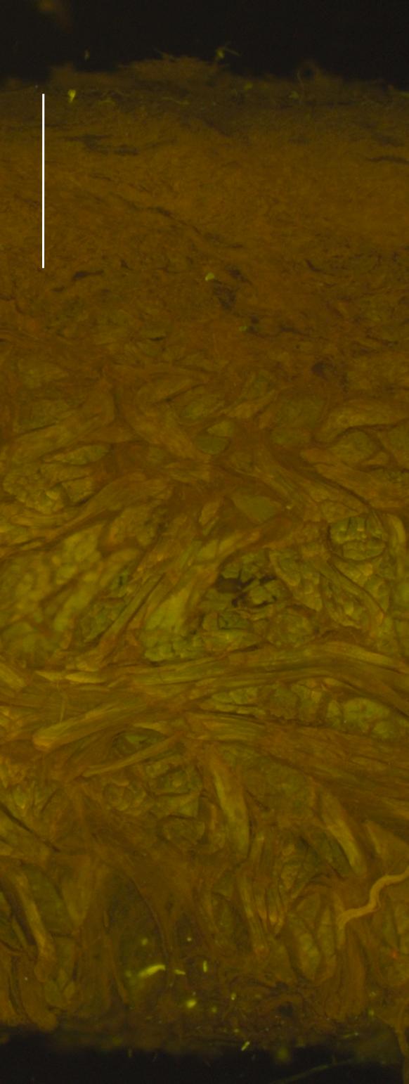 Depth and homogeneity of the consolidant across the penetration zone within the leather were examined by adding 0,01% Rhodamine B to the solution and observing thin sections of the treated leather with a fluorescence microscope (filter: excitation BP 573-613nm; splitter filter LP 510; emission BP 512-542nm) (Soppa 2018)(Figs. 2 & 3).