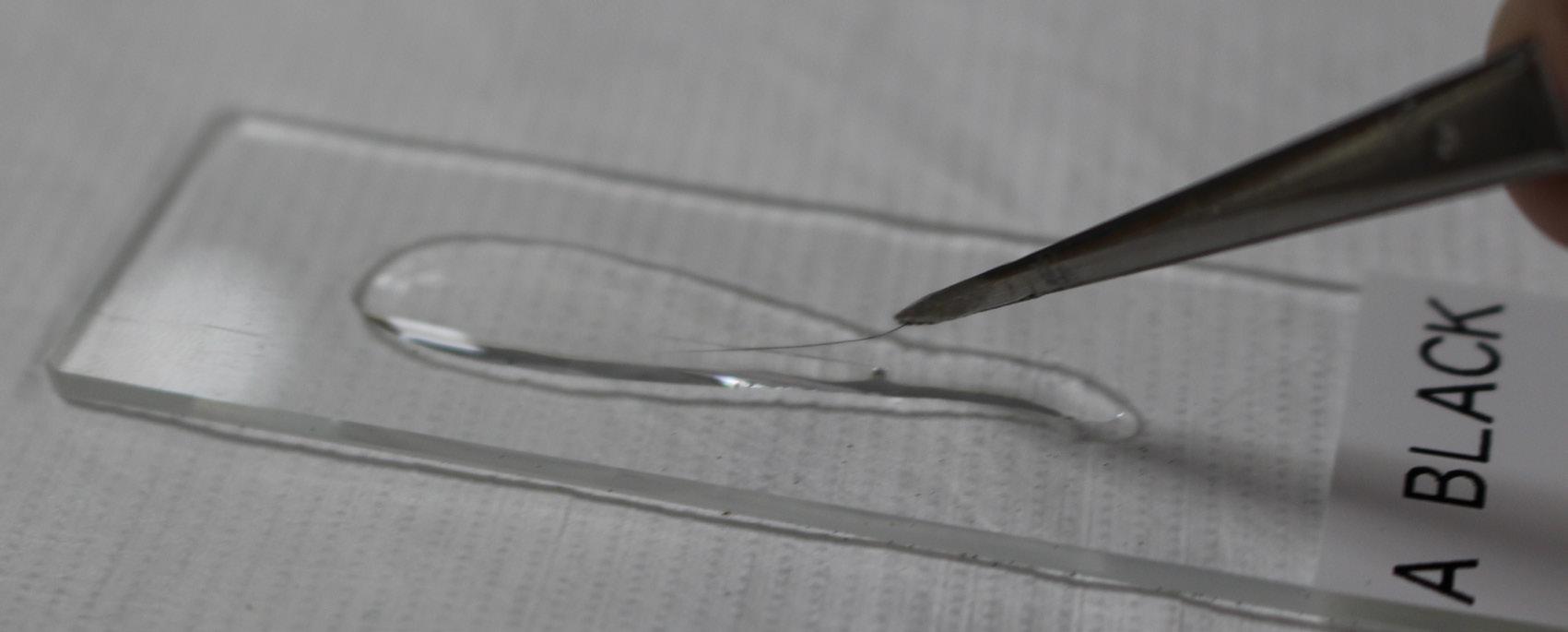 1. Place the hair on a slide and add one drop of Canada balsam on top