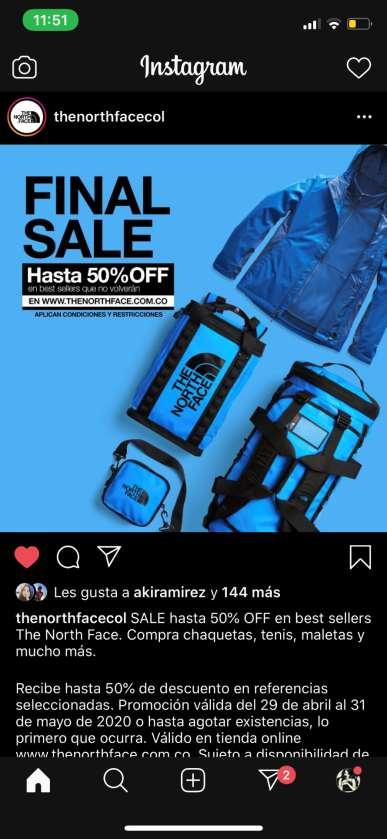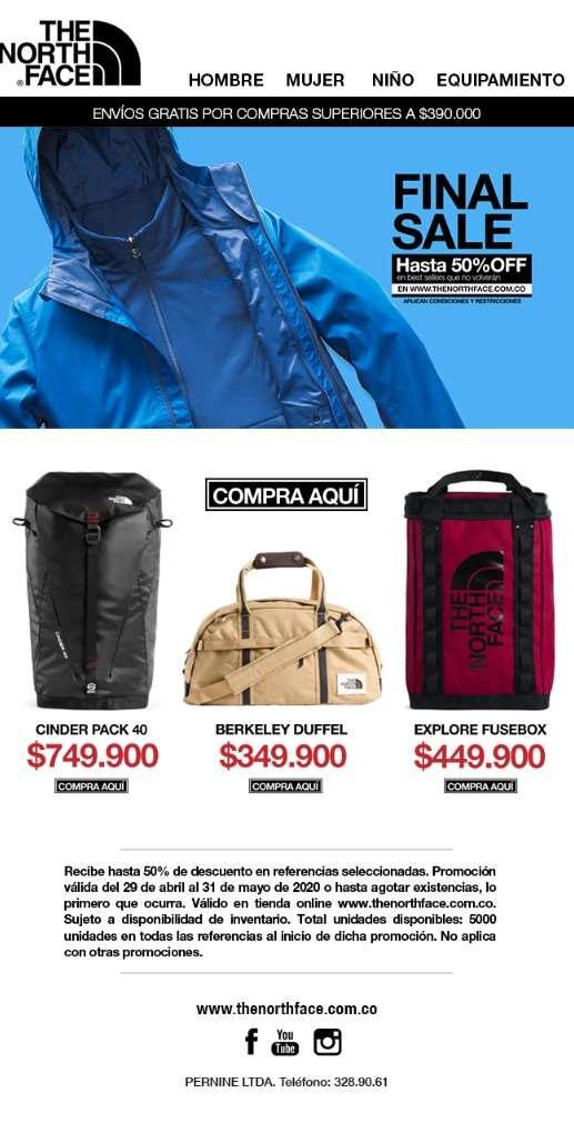 Recibe hasta 50% de descuento en referencias seleccionadas. Promoción válida del 27 de abril al 31 de mayo de 2020 o hasta agotar existencias, lo primero que ocurra. Válido en tienda online www.thenorthface.com.co. Sujeto a disponibilidad de inventario. Total unidades disponibles: 5000 unidades en todas las referencias al inicio de dicha promoción. Aplica con otras promociones. .