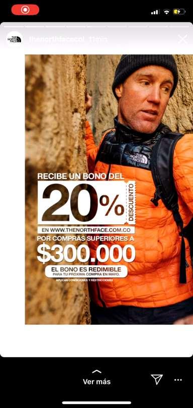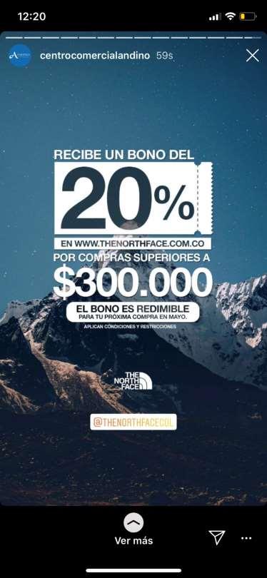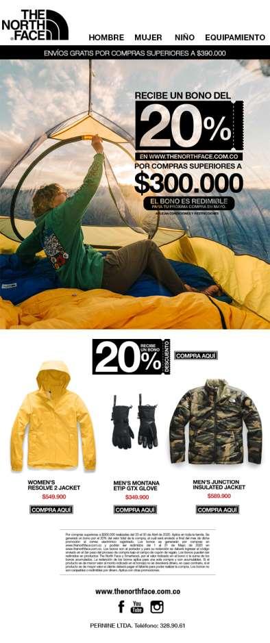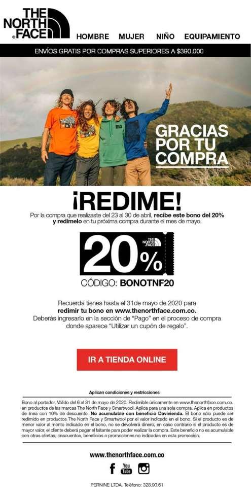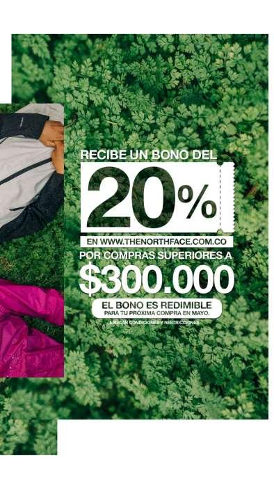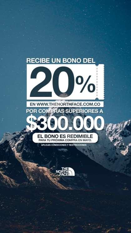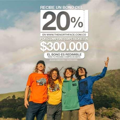 Por compras superiores a $300.000 realizadas del 23 al 30 de Abril de 2020. Aplica en toda la tienda. Se generará un bono por el 20% del valor total de la compra, el cuál será enviado a final del mes de dicha promoción al correo electrónico registrado. Los bonos se generarán por compras en www.thenorthface.com.co y podrán ser redimidos del 1 al 31 de Mayo de 2020 en www.thenorthface.com.co. Los bonos son al portador y para su redención se deberá ingresar el código enviado en el 3er paso del proceso de compra bajo el campo de cupón de regalo. Los bonos pueden ser redimidos en productos The North Face y Smartwool, por el valor indicado en el bono o la suma de los bonos acumulados. La redención de los bonos aplica para una sola compra y son acumulables. Si el producto es de menor valor al monto indicado en el bono(s) no se devolverá dinero, en caso contrario, si el producto es de mayor valor el cliente deberá pagar el faltante para poder realizar la compra. Los bonos no son canjeables o redimibles por dinero. Aplica con otras promociones.
