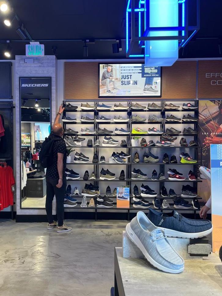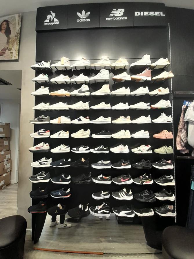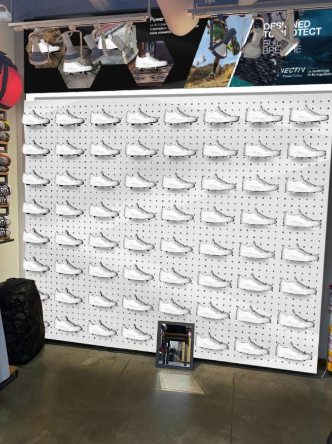 La organización del espacio de exhibición de calzado varía según la tienda o marca. Algunas optan por paredes completas, donde exhiben de 7 a 8 pares de calzado de manera horizontal en bajadas de 7, 8 o 9 referencias hacia abajo, lo que incrementa la capacidad de carga de cada segmento. En las tiendas especializadas, se encuentran áreas amplias que pueden abarcar 3 o 4 paredes dedicadas al calzado, permitiendo tanto cargas altas como un rango de visión óptimo con alturas promedio o bajas. Depende del tipo de exhibición, productos y colecciones que se quieren destacar.