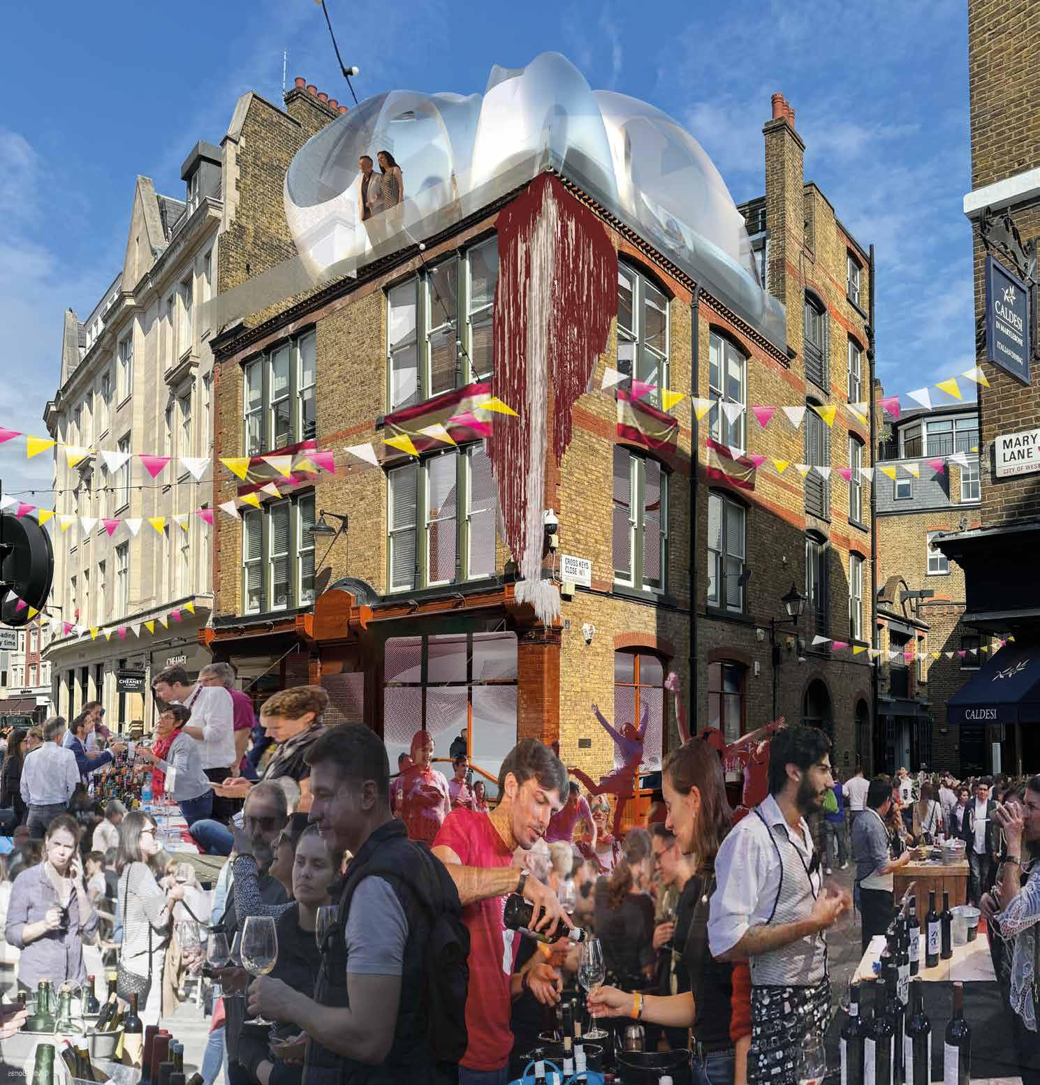 The user enters the rooftop where he is guided to his private cave for the wine tasting.