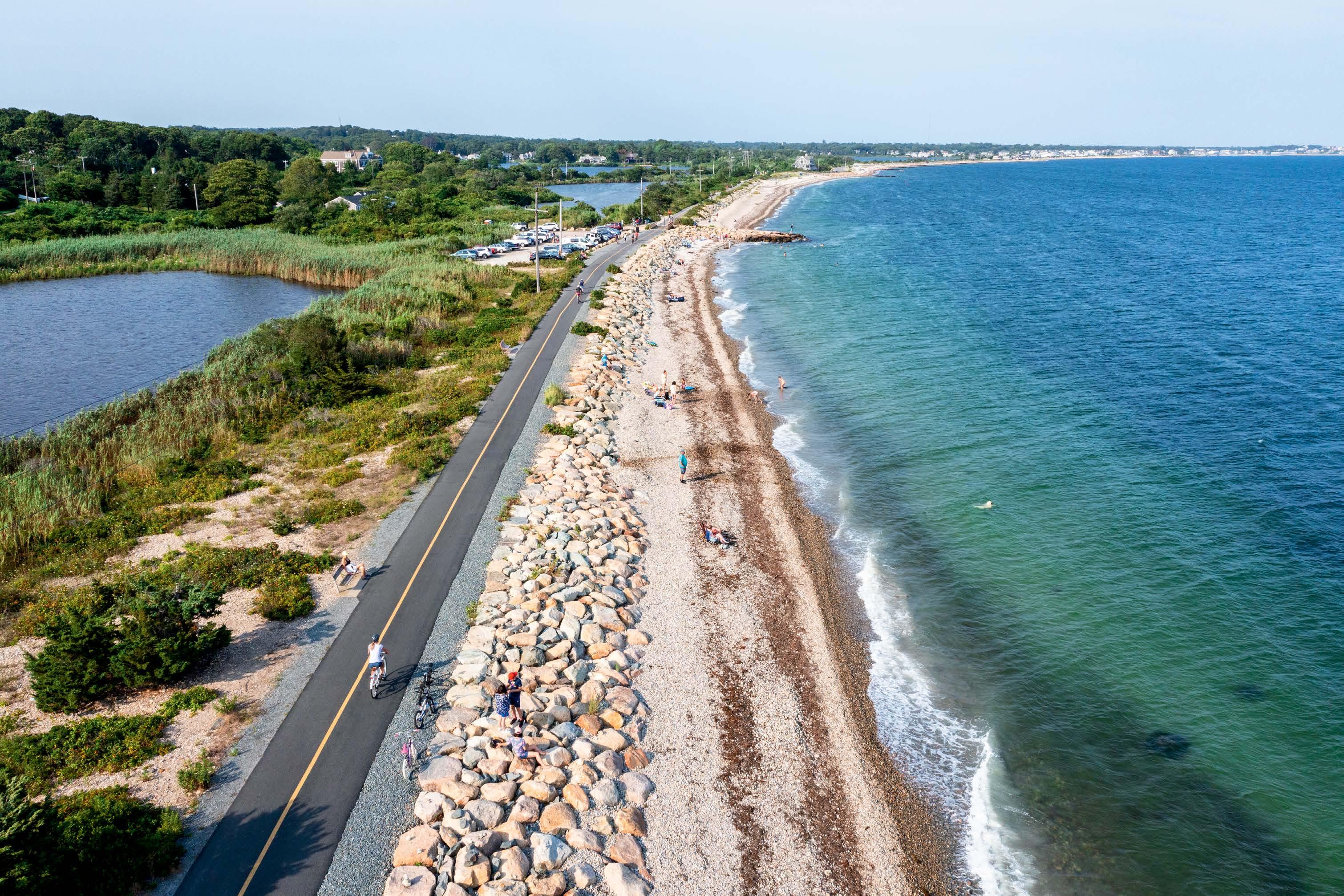 Cyclists cruise alongside the Atlantic on the Shining Sea Bikeway in Falmouth, Massachusetts.