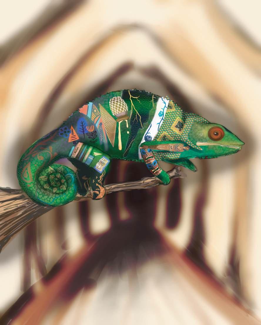 Frustrated, the chameleon dashed out of the shop and went to the town’s renowned grand hallway. There were mirrors and translucent objects all around, so it could easily check if it was blending in well. It felt relieved to realize its tail was starting to change colors again, as the chameleon could ensure that at least a prominent part of itself was blended in with its surroundings. Believing that it was able to fully camou age now, the chameleon happily wandered around the halls, admiring the paintings of the famous and mourning at the memorial.