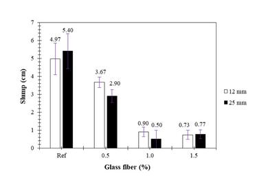 As higher GF percentage are added, less settlement occurs, regardless fiber length Other studies report the same trend. Mohajerani et al. attributes the loss of workability to the lower ductility of the GF (rigid), generating resistance to concrete flow.