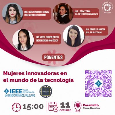 En conmemoración al día de la muj boliviana, se llevó a cabo un even especial que reunió a destacada ingenieras reconocidas por su innovació y liderazgo en el mundo de la tecnologí En este evento se compartieron tema como a inteligencia artificial, ciberseguridad y el desarrollo d software, destacando los avances qu han impulsado tanto en Bolivia como nivel internacional. La participación d estas mujeres no solo subraya su talento, sino que también busca inspirar a las nuevas generaciones a perseguir carreras en ciencia y tecnología, fomentando un futuro más inclusivo y diverso. Este especial evento estuvo organizado por la Rama Estudiantil IEEE en colaboración con la Sociedad Científica de Electrónica, Telecomunicaciones y Mecatrónica.
