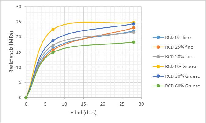Gráfico 1 Evolución de la resistencia a compresión usando RCD fino y grueso para 7 y 28 días