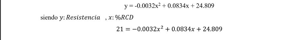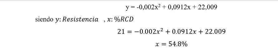 Resolviendo la ecuación se obtiene que, para llegar a una resistencia de 21 MPa, el límite de incorporación de RCD seria de 49.9%