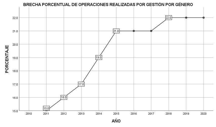 El análisis de datos del Sistema Financiero Nacional de los últimos 10 años muestra un crecimiento de las eraciones de crédito, depósito y os servicios reflejando un remento en los indicadores. En el áfico se presenta el número de ditos otorgados en el periodo 201020 según género y la brecha o erencia porcentual entre hombres y jeres para cada año es bastante plia.